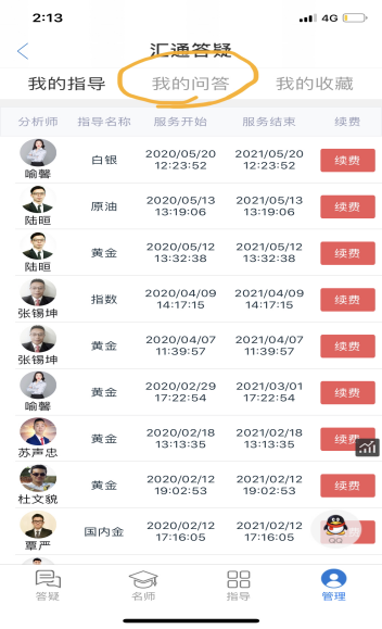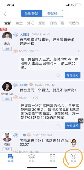 (2)下载名师指导app或下载汇通财经app登录您的账号后点击名师指导点击右下方管理也可看到您的提问与回复
