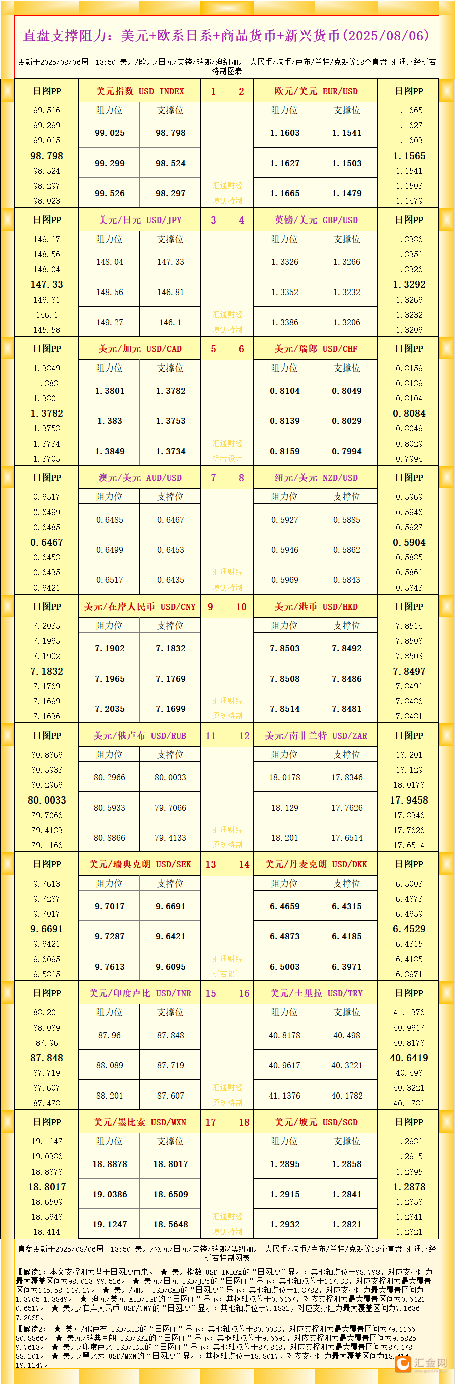 一张图看直盘支撑阻力:美元+欧系日系+商品货币+新兴货币,更新于2025年8月6日周三13:50,具体美元/欧元/日元/英镑/瑞郎/澳纽加元+人民币/港币/卢布/兰特/克朗等18个直盘,更多详见汇通财经析若特制图表中的内容。