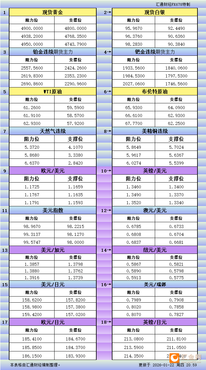 1月22日美市更新支撑阻力:18品种支撑阻力(金银铂钯原油天然气铜及十大货币对)