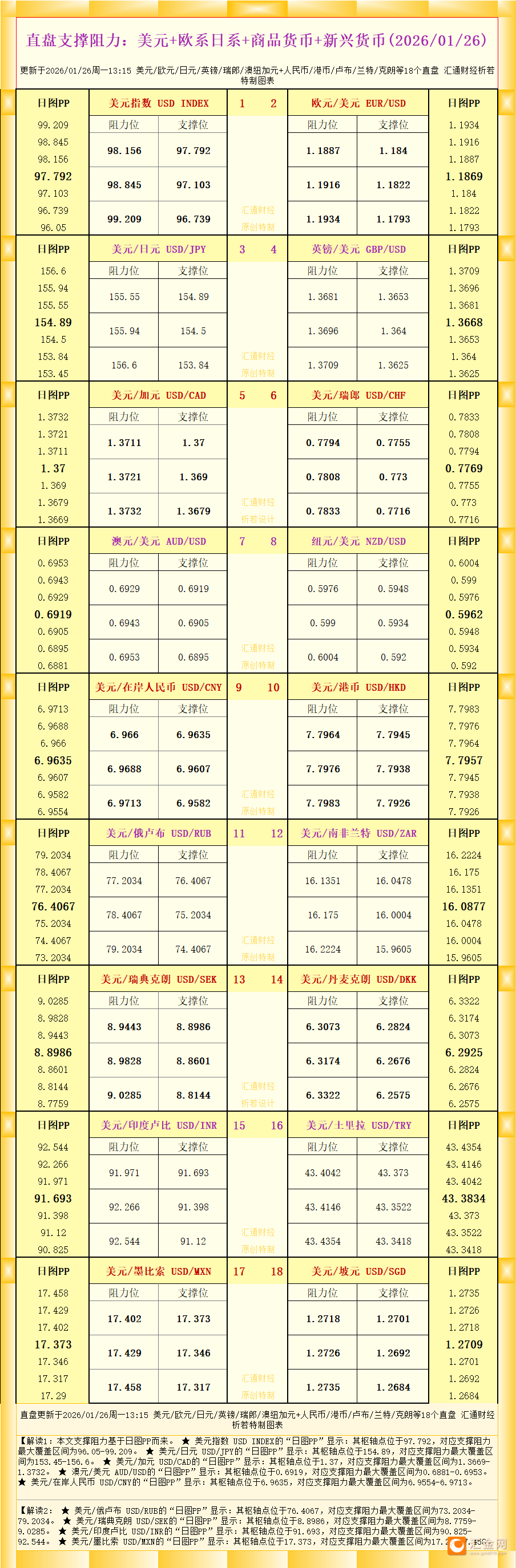一张图看商品支撑阻力:金银油气+铂钯铜+农产品期货,更新于2026年1月26日周一13:15,具体覆盖金银铂钯铜+原油天然气燃油+小麦玉米棉花14个品种,更多详见汇通财经析若特制图表中的内容。