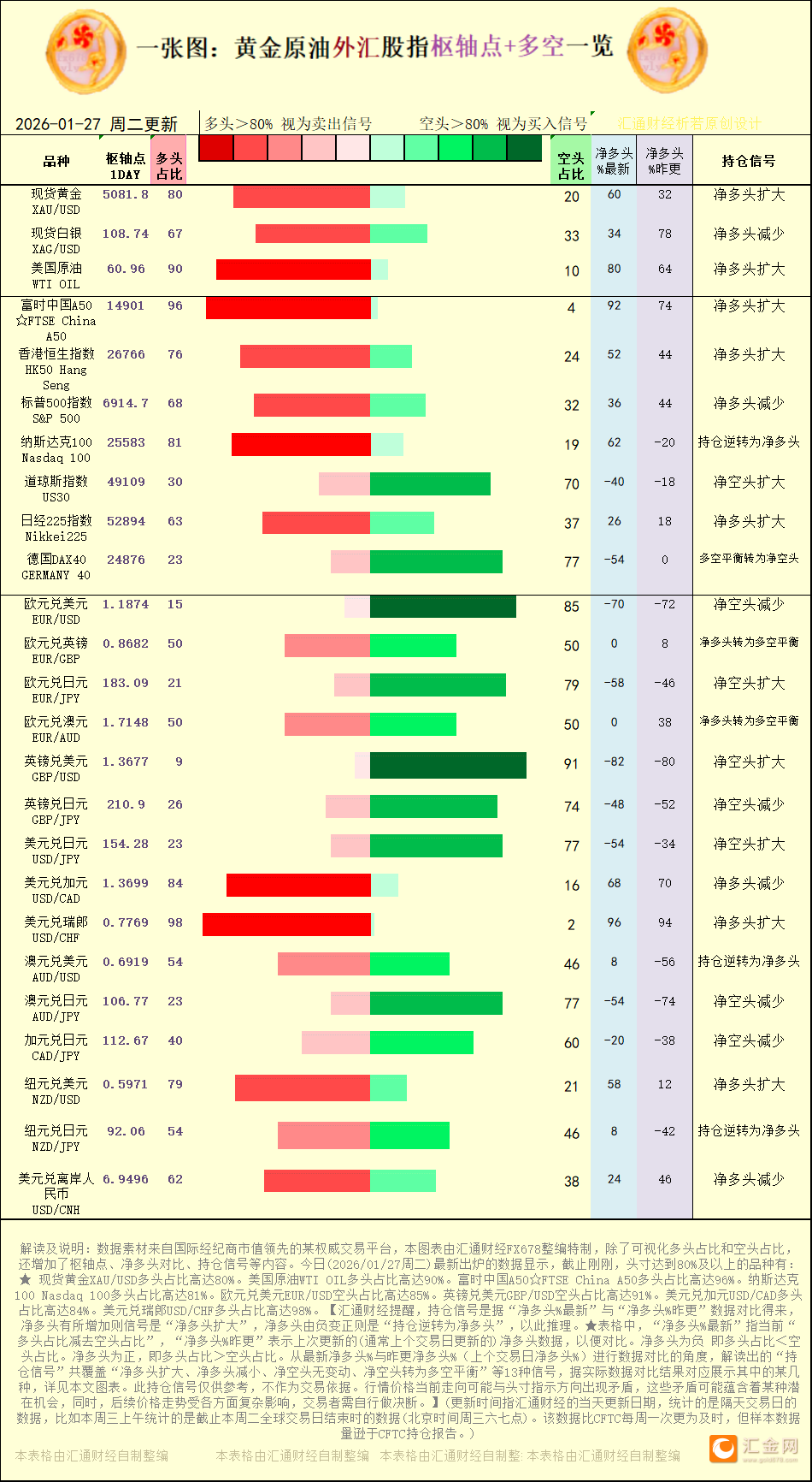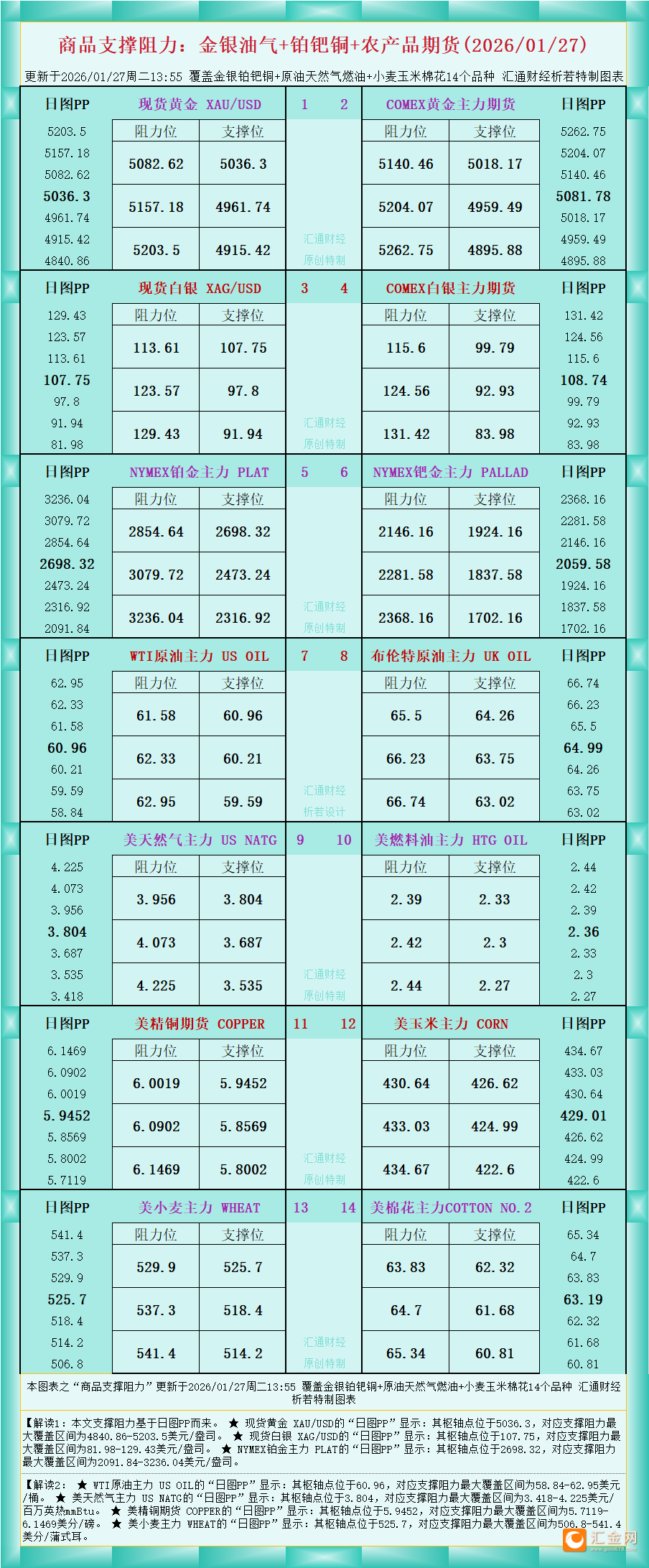 一张图看直盘支撑阻力:美元+欧系日系+商品货币+新兴货币,更新于2026年1月27日周二13:55,具体美元/欧元/日元/英镑/瑞郎/澳纽加元+人民币/港币/卢布/兰特/克朗等18个直盘,更多详见汇通财经析若特制图表中的内容。