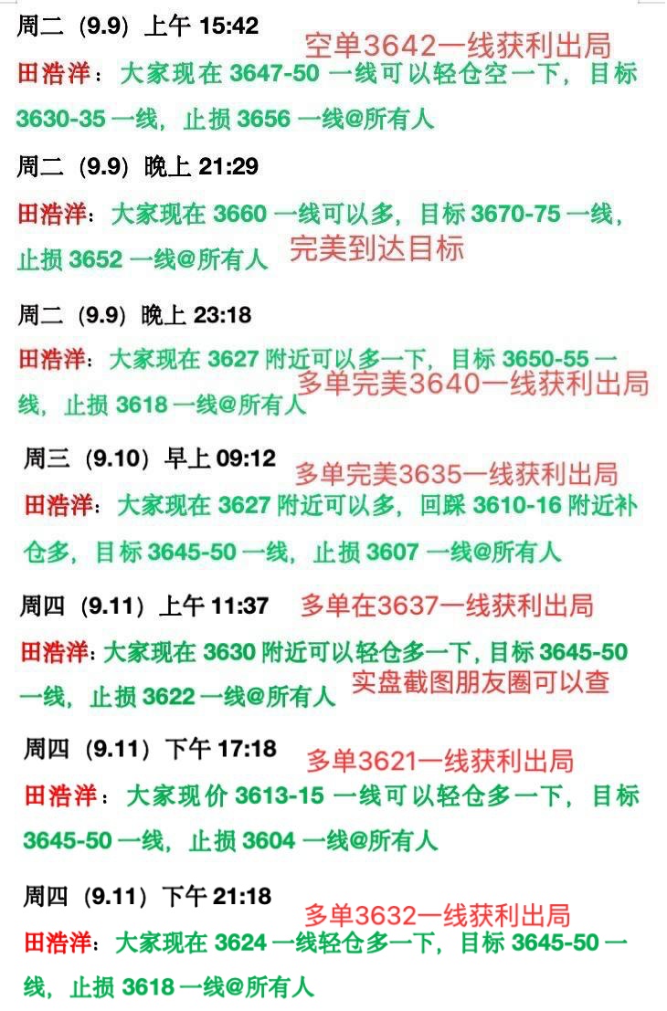 09-11 23:26黄金今天我们多单完美把握,早间我们回踩3630一线做多,完美在3637一线获利出局,下午我们在3613附近做多,完美在3621一线获利出局,美盘我们继续关注下方支撑,回踩不破我们继续可以多,毕竟趋势依旧没有改变,多空风水岭在3597-3600一线,所以只要不破3600一线我们依旧可以回踩做多进行操作,坚持回踩做多思路不动摇。如果你目前操作不理想,希望田浩洋能让你的投资少走弯路,欢迎前来沟通交流!