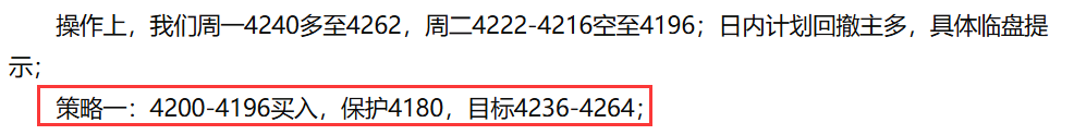 策略一:4220-4214买入,保护4100,目标4264;