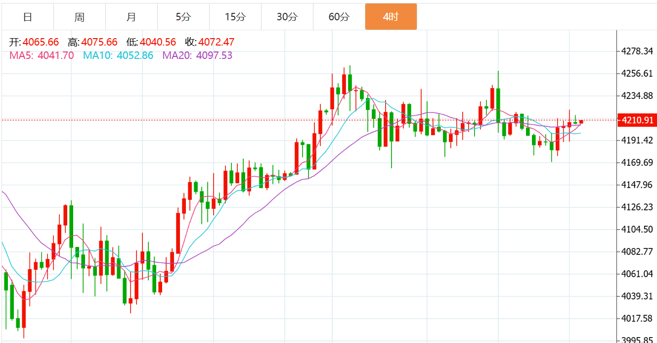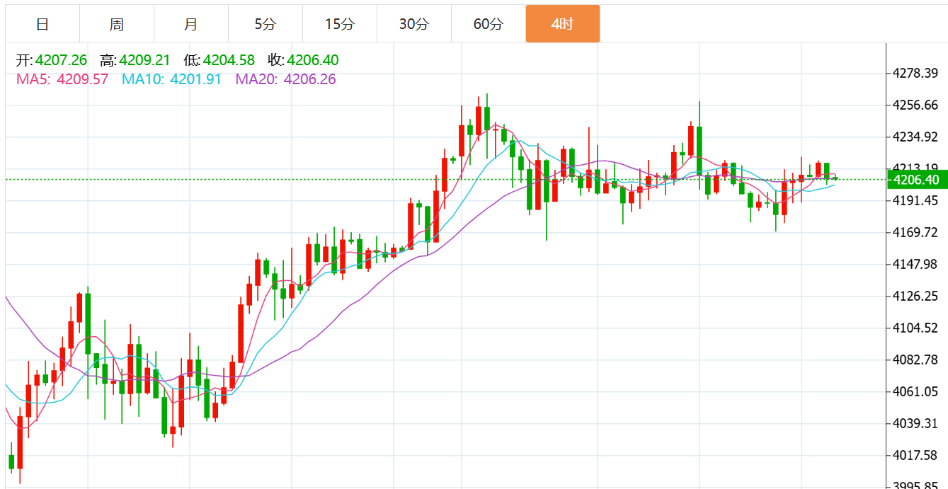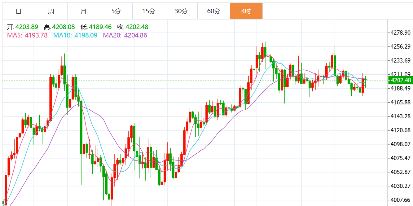黄金技术面分析:黄金上周高位区间盘整,周初在4220一线先拉升,日线最高触及到了4265附近强势震荡回落周线最低给到了4162附近区间盘整,周线最终收线在了4196一线以一根上影线稍长于下影线的纺锤形态收线,黄金多空反复整体冲高回落,收于4200下方,早间运行于4208附近回到收敛震荡的区间,短期还需关注短期趋势线的支撑位置4175附近,此位或是日内低多的支撑位,若强势破位4160,则不考虑做多了。本周四凌晨将公布美联储利率决议,那么黄金在美联储利率决议前大概率还是维持大区间震荡的走势。1小时线继续上下来回穿梭还是继续震荡,黄金在4160-4265区间大区间震荡,冲高易回落,探底易回升的走势,黄金在数据前大概率还是继续维持震荡,黄金晚上回落4180支撑上继续逢低多。综合来看,黄金今日短线操作思路上贺博生建议以反弹高空为主,回踩低多为辅,上方短期重点关注4235-4255一线阻力,下方短期重点关注4190-4170一线支撑。