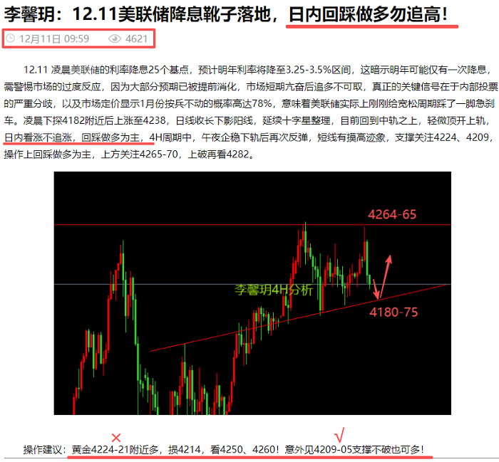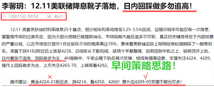 12.5 上周五,策略中提示黄金白盘先震荡对待,午后冲高4230后正是策略高空位置,馨玥也没有犹豫,公开安排了黄金4228空单,顺利回落至4215目标,收获12-13点利润!晚间文章中提示谨防冲高回落,行情同样完美应验!不过我们选择观望收尾,守好本周的利润即可!
