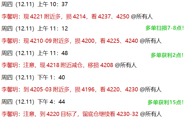 12.5 上周五,策略中提示黄金白盘先震荡对待,午后冲高4230后正是策略高空位置,馨玥也没有犹豫,公开安排了黄金4228空单,顺利回落至4215目标,收获12-13点利润!晚间文章中提示谨防冲高回落,行情同样完美应验!不过我们选择观望收尾,守好本周的利润即可!