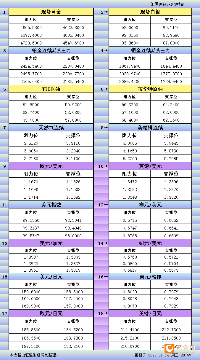 1月14日美市更新支撑阻力:18品种支撑阻力(金银铂钯原油天然气铜及十大货币对)