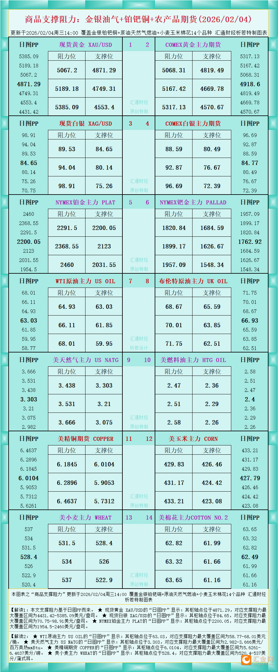 一张图看商品支撑阻力:金银油气+铂钯铜农产品期货(2026年2月4日)
