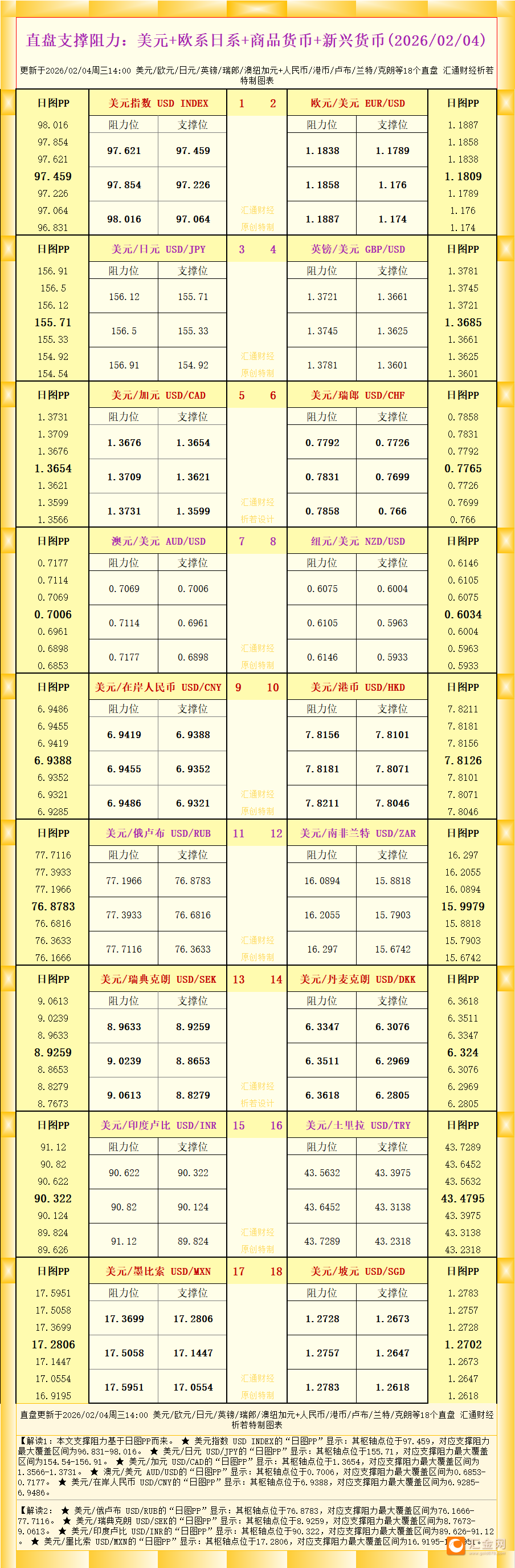 一张图看18个直盘外汇支撑阻力:美元+欧系日系+商品货币+新兴货币(2026年2月4日)