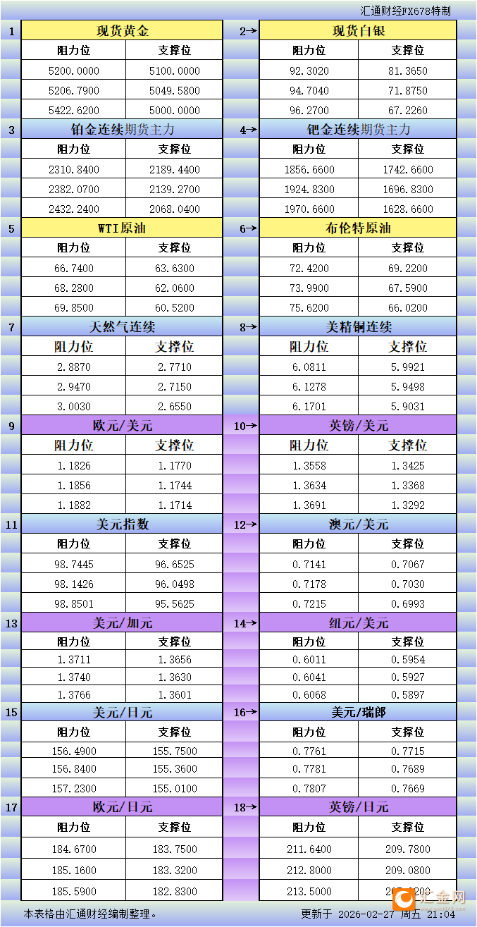 英国央行首席经济学家皮尔:我们不应因由一次性因素导致的总体通胀率下降而产生错误的安全感。通胀回落进程“进展顺利且未受破坏”。通胀回落尚未完成,潜在压力是关键 02-27 21:17【第二艘国产大型邮轮“爱达·花城号”主体建造基本完成 】 27日从中船集团了解到,我国第二艘国产大型邮轮“爱达·花城号”主体建造已基本完成,计划于3月中旬出坞,转入码头系泊调试新阶段。据悉,“爱达·花城号”邮轮总吨位达到14.19万吨。与首艘国产大型邮轮“爱达·魔都号”相比,“爱达·花城号”邮轮在设计和建造上进行了诸多改进。(新华社) 02-27 21:16美国国务院已下令从伊拉克首都巴格达的美国大使馆撤离非必要工作人员及其家属 02-27 21:16现货铂金刚刚突破2380.00美元/盎司关口,最新报2380.15美元/盎司,日内涨4.49%; Nymex铂金期货主力最新报2396.4美元/盎司,日内涨7.00%; 02-27 21:15日本财务省周五宣布,1月29日至2月25日期间,日本未动用日圆进行外汇干预 02-27 21:15现货黄金刚刚突破5220.00美元/盎司关口,最新报5220.08美元/盎司,日内涨0.68%; COMEX黄金期货主力最新报5238.40美元/盎司,日内涨0.85%; 02-27 21:15【亚洲油市惊现分化,VLSFO创四个月新高石脑油逼近一年峰值】 ⑴ 亚洲超低硫燃料油(VLSFO)裂解价差周五升至逾四个月高位,3月VLSFO裂解价差收于每桶升水7.75美元。尽管现货价差基本稳定在每吨2美元左右,但远期市场已显现复苏迹象。市场消息人士称,低硫燃料油供应前景指向不一,短期内可能略有收紧,但目前即期装运日期供应依然充足。 ⑵ 亚洲柴油市场周五收复部分失地,3月-4月跨月合约逆价差扩大,现货价差则跌至一个月低点每桶升水84美分。贸易消息人士称,4月价格关键驱动因素将是中国现货出口供应量,4月现货议价将于下周启动。柴油裂解价差略低于每桶22美元,创本周最低点。航煤方面,中国对3月货物的销售依然活跃,航煤/柴油价差重新回到平价水平。 ⑶ 亚洲石脑油价格周五上升,裂解价差逼近一年高点,收于每吨111美元,创去年3月底以来新高。东西方价差达到每吨48美元的近六年高位,4月现货交易活跃。4月开放规格石脑油成交价多数较日本到岸价每吨升水9至13美元。汽油裂解价较上周回升至每桶8美元,收复三周以来部分跌幅。380-cst高硫燃料油则持续承压,裂解价差为贴水5.15美元/桶。 02-27 21:15布伦特原油期货主力刚刚触及73.00美元/桶关口,最新报73.00美元/桶,日内涨2.84% 02-27 21:08现货黄金刚刚突破5210.00美元/盎司关口,最新报5210.12美元/盎司,日内涨0.49%; COMEX黄金期货主力最新报5227.00美元/盎司,日内涨0.63%; 02-27 21:08现货黄金刚刚突破5200.00美元/盎司关口,最新报5200.92美元/盎司,日内涨0.31%; COMEX黄金期货主力最新报5216.70美元/盎司,日内涨0.43%; 02-27 21:07
