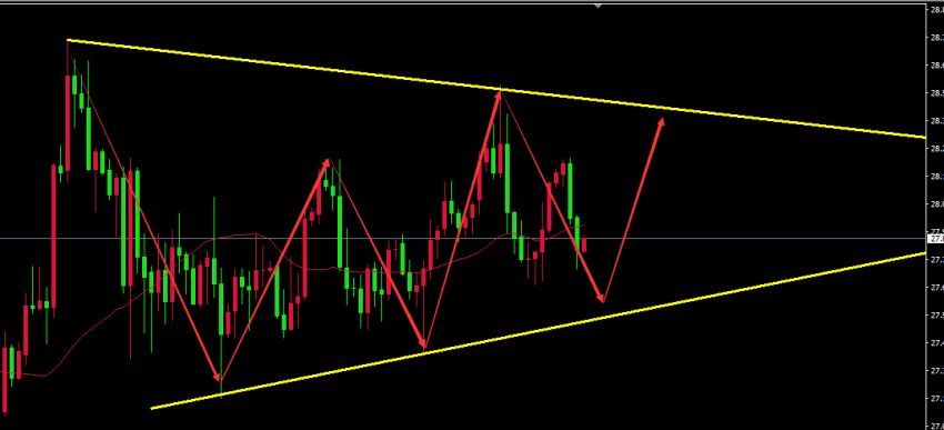 06-03 19:10从技术形态上看,白银是区间震荡走势,既然是区间走势,那么白银的操作思路就很明确。上方遇阻力区间做空,下方遇支撑区间做多的基本思路。白银的区间走势呈三角形整理走势,下方低点在抬高,上方高点在压低。所以白银需要一波突破走势,方能明确主方向。白银美盘短线建议三角形区间底部27.65~27.60区域考虑做多,风控点27.4下方,目标位28.00和28.20。)图表是4小时图