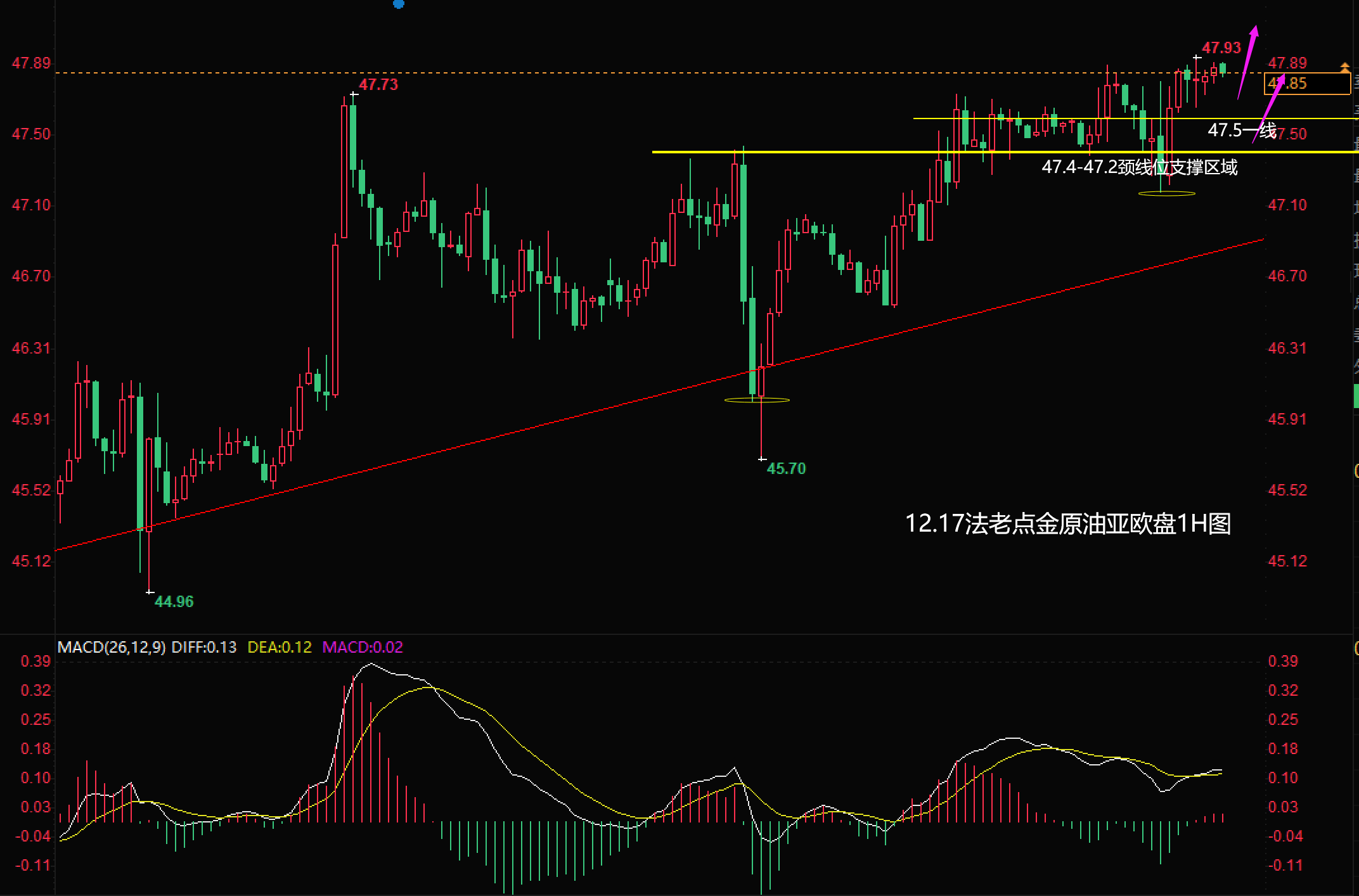 12/17 08 : 09【法老点金】12.17【原油】欧美盘:原油昨宽幅震荡区间企稳夯实47关口支撑力度,今日依托昨日颈线位继续主多