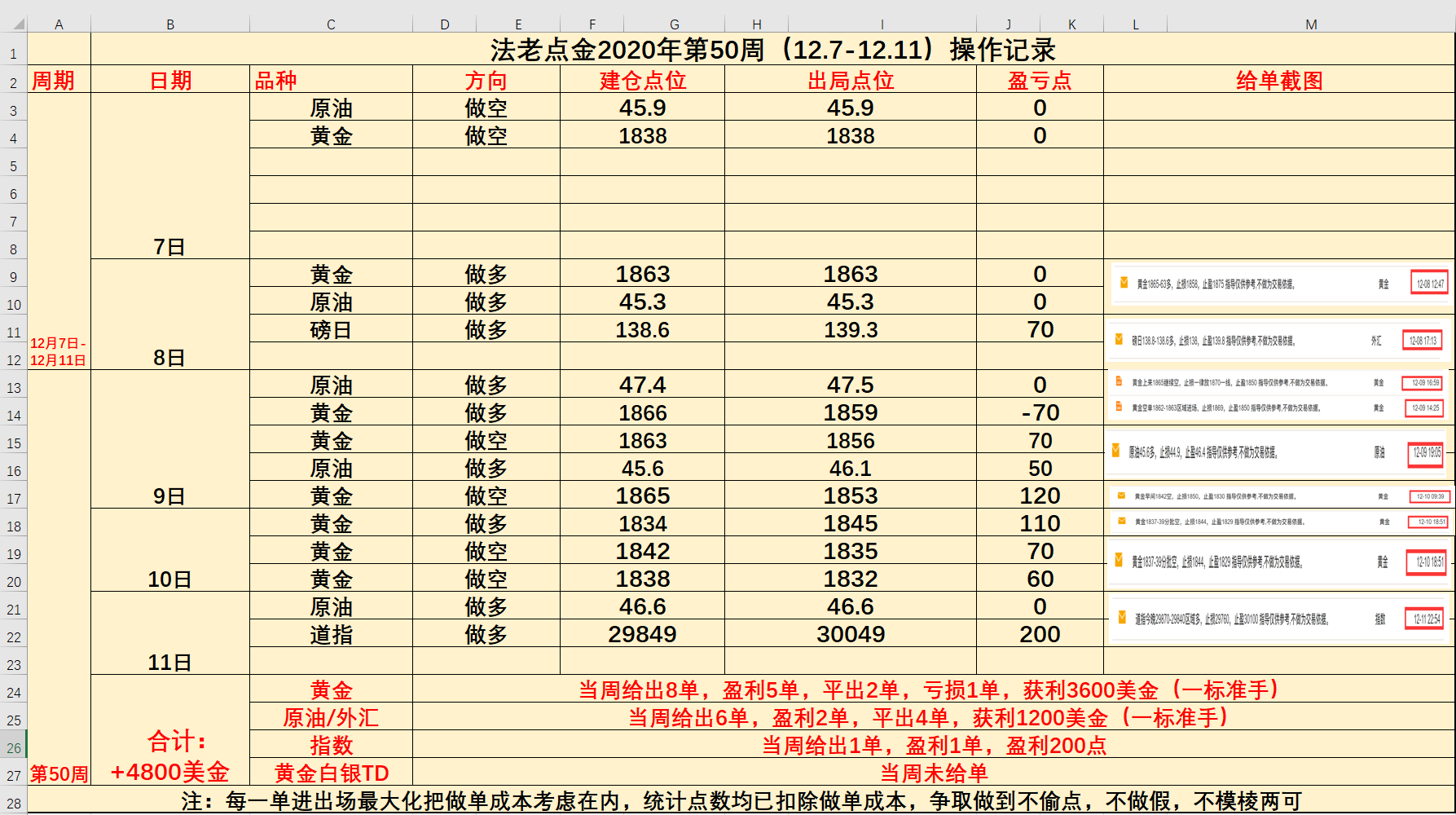 ; ; ;其中第50周黄金给出8单,盈利5单,平出2单,亏损1单,获利3600美金(一标准手),原油外汇给出6单,盈利2单,平出4单,获利1200美金(一标准手)。指数当周给出1单,盈利1单,盈利200点。第51周黄金黄金共给出7单,盈利5单,平出2单,获利4300美金(一标准手),原油外汇给出3单,盈利2单,平出1单。获利1500美金(一标准手).指数给出2单,盈利2单,获利710点(持有中)。两周总计27单,亏损1单,盈利/保本26单,胜率96%两周合计盈利10600美金(指数盈利未统计在内),交易不是短跑而是马拉松,做到一周是侥幸,能够持续盈利才是实力!