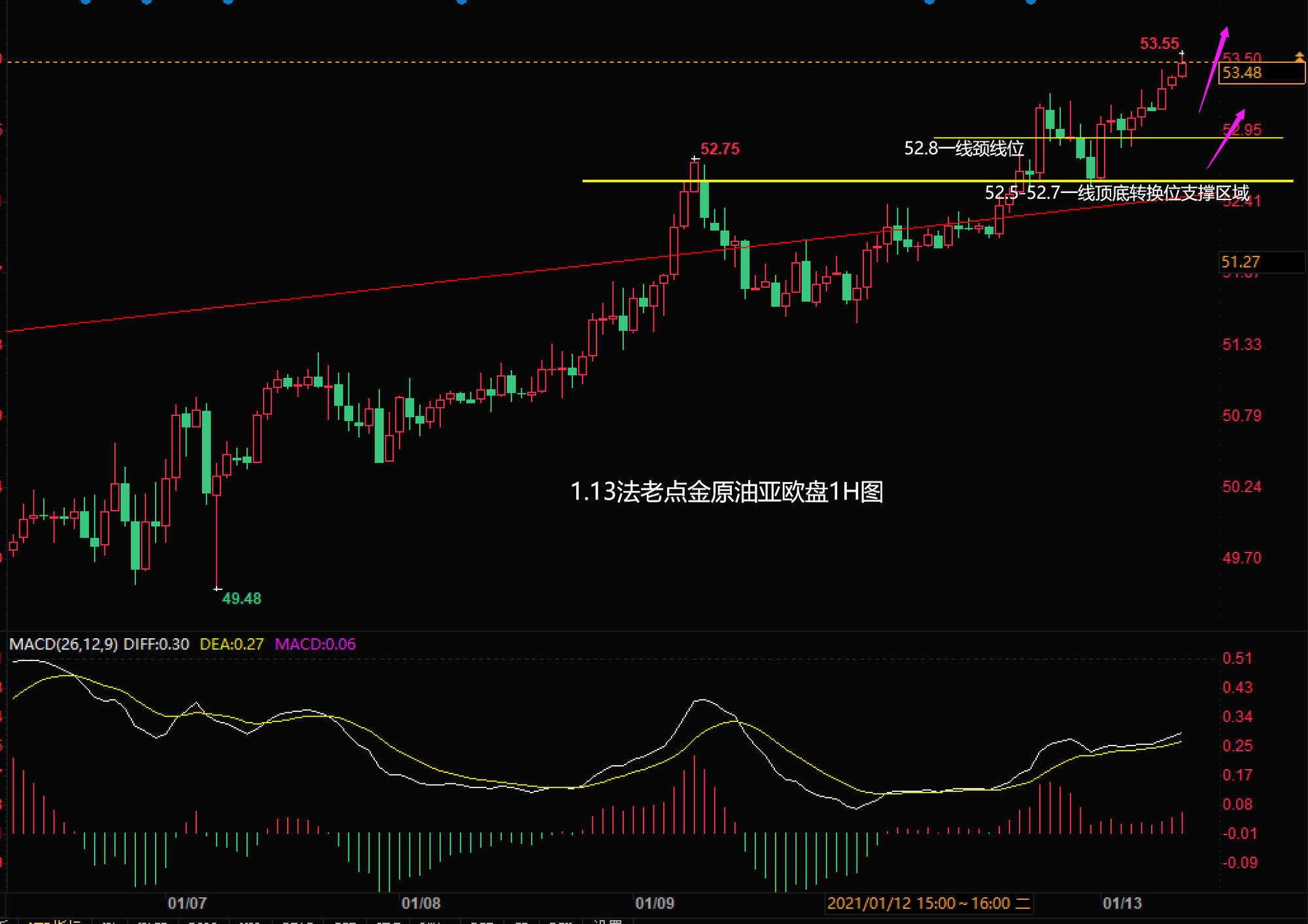 01/13 09 : 01【法老点金】1.13【原油】亚欧盘:原油昨日继续强势上行破高,今日依托52.5一线继续主多上看