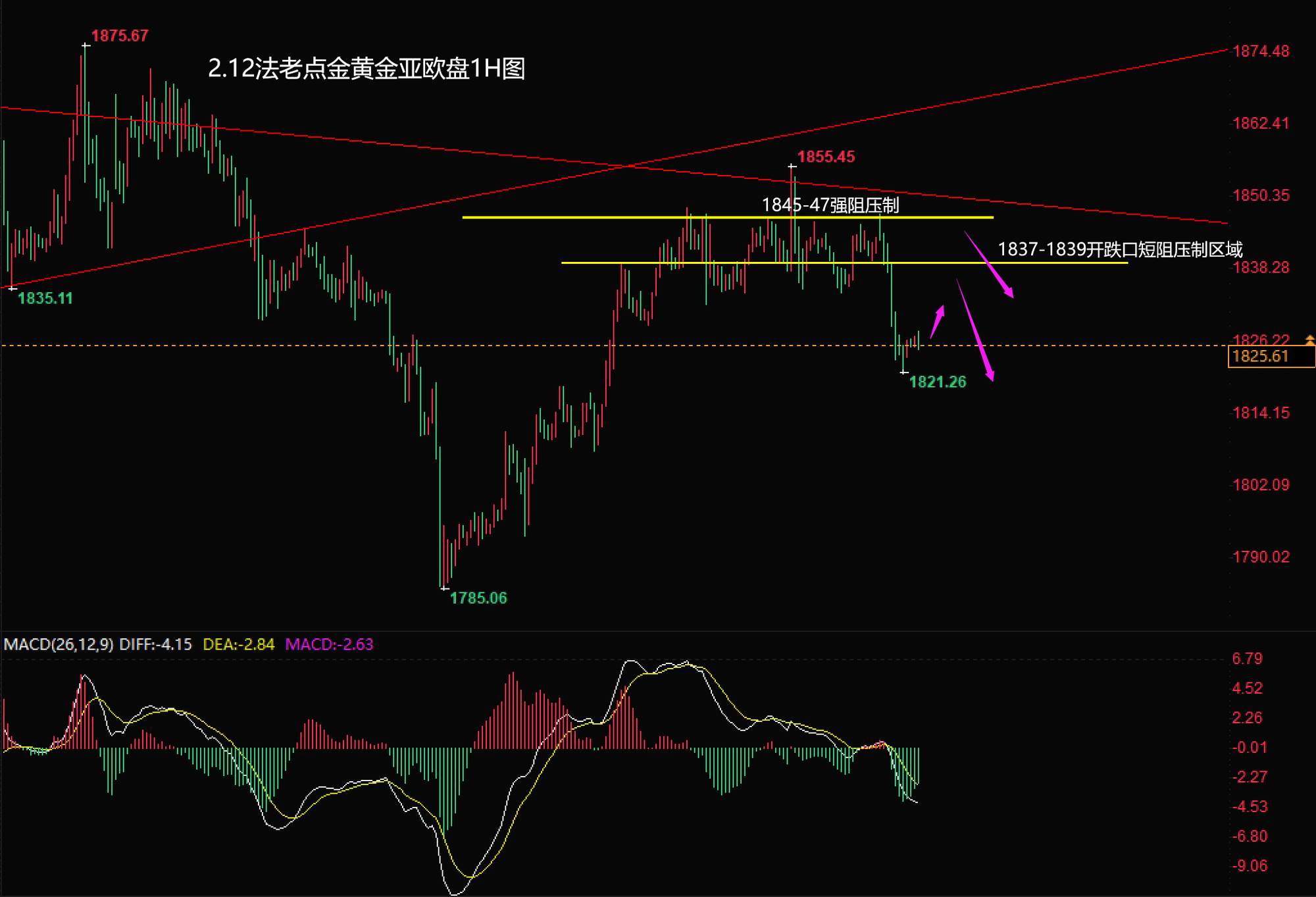 【法老点金】2.12【黄金】亚欧盘:黄金昨如期迎来冲高回落破底,短线空头继续发力下看1800关口已成定局