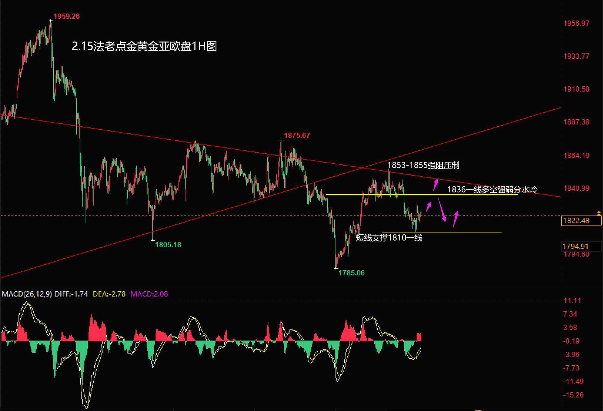 2.15【黄金】亚欧盘:黄金上周1821空1813收,今日欧盘多空强弱是关键