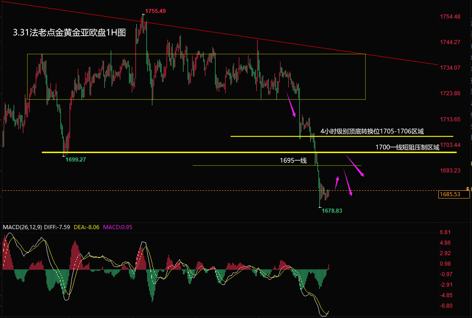 【法老点金】3.31【黄金】亚欧盘:黄金昨日空头极弱下行继续破底,今日依托1706主空下看