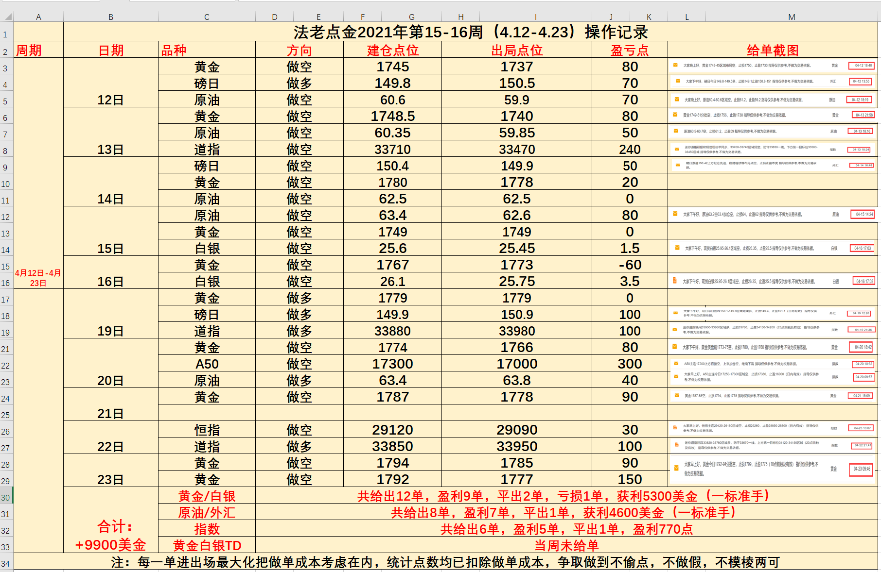 ; ; ;两周合计给出26单,盈利20单,平出5单,亏损1单,其中黄金给出12单,盈利9单,平出2单,亏损1单,获利5300美金(一标准手),