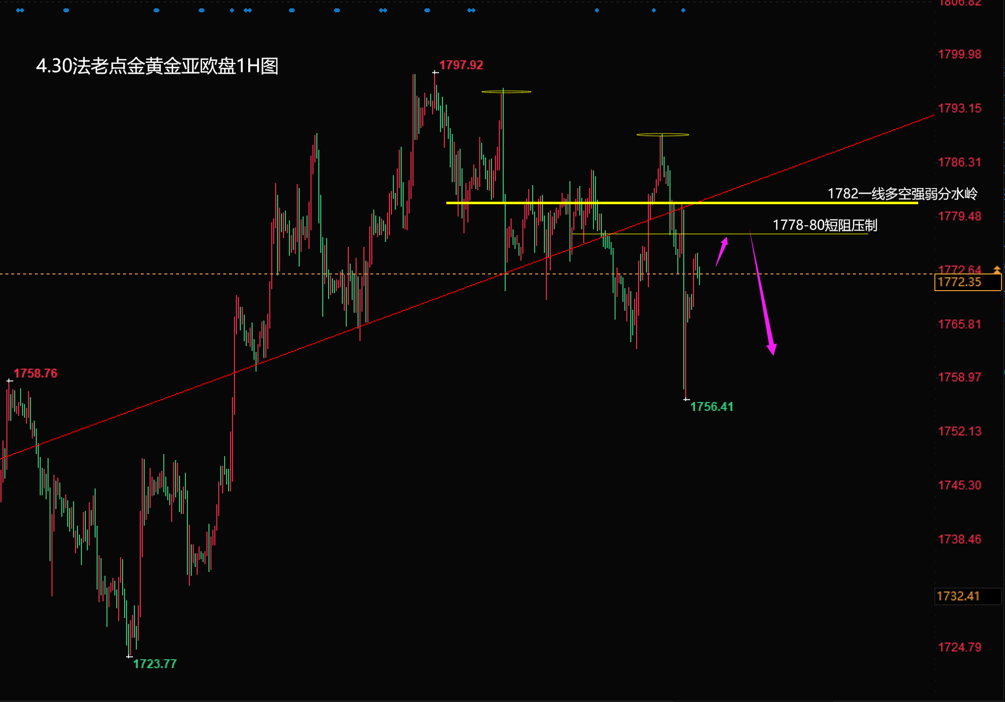 4.30【黄金】亚欧盘:黄金昨冲高回落宽幅震荡洗盘拉锯1790双顶成立,今日1781一线定强弱