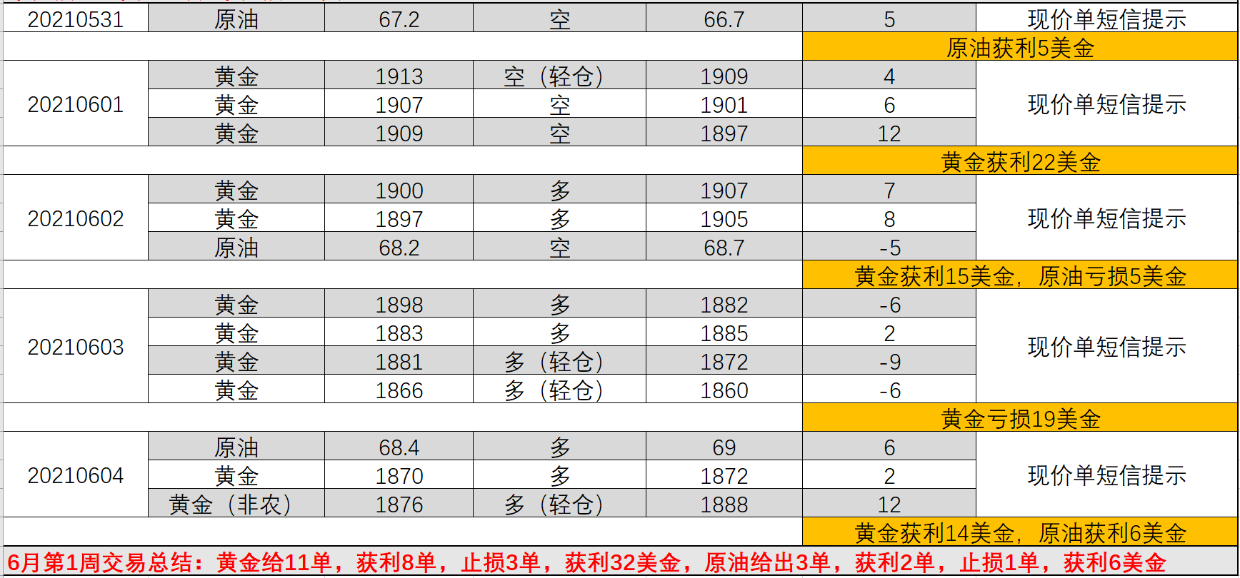 06/05 12 : 45六月第1周短信提示总结:黄金给11单,获利8单,止损3单,共计获利32美金,原油给3单,获利2单,止损1单,获利6美金。6月非农交易取胜,大赚14美金。交易都是一单到底,拿大利润,提示现价进,出,不刷单,不剥头皮,连续发挥稳,准,狠的特点,轻松交易,无往不利,整点播报,时刻关注行情变化,不用投资者时刻盯盘,为你的交易保驾护航。只要是做实盘交易的人都知道,做交易非常辛苦,非常烧脑,但只要做上根本停不下来,每每周末看到自己账户丰满,一周的疲惫就烟消云散。6月第1周精彩不断,接下来三周做技术面,自信满满,大赚特赚。