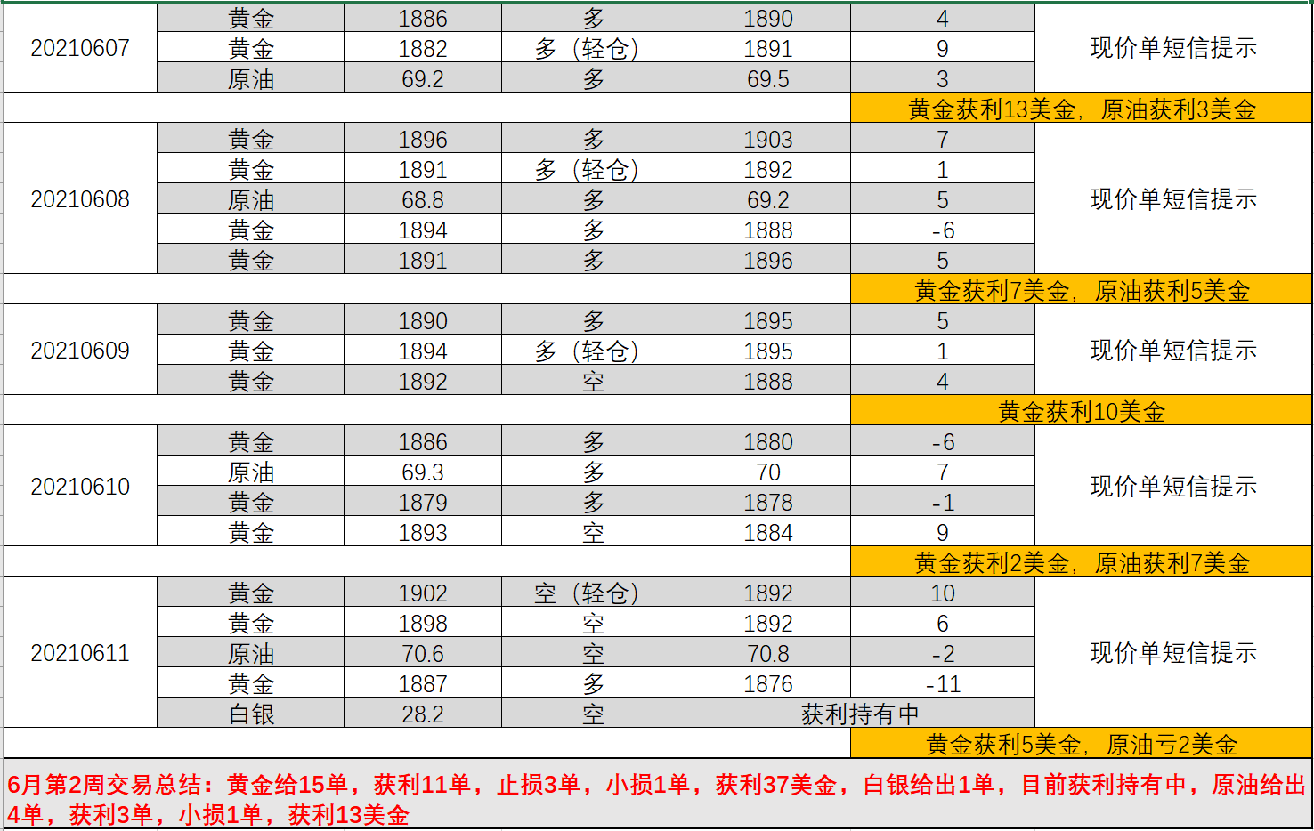 06/12 19 : 126月第2周短信提示交易总结:黄金给15单,获利11单,止损3单,小损1单,共计获利37美金,白银中线交易获利持有中,原油给4单,获利3单,小损1单,获利13美金。6月第二周行情比较复杂,来回震荡走势较多,多次出现深v行情,很难做到一单到底,拿到全部利润,因此,有两单10/12美金的大利润,做到了,没有提示出,不然本周利润很大。本周每日早间分析的思路精准无误,遗憾的是,周五从1903开空,1898开空,思路是看破1883见1875,但没有坚持到最后反而搏反弹做了一波止损交易,这种操作是严重失误,需要避免,改进。6月还有2周,将会火力全开,回归到3/4/5月赚翻的节奏,做出有效利润,把账户丰满起来。