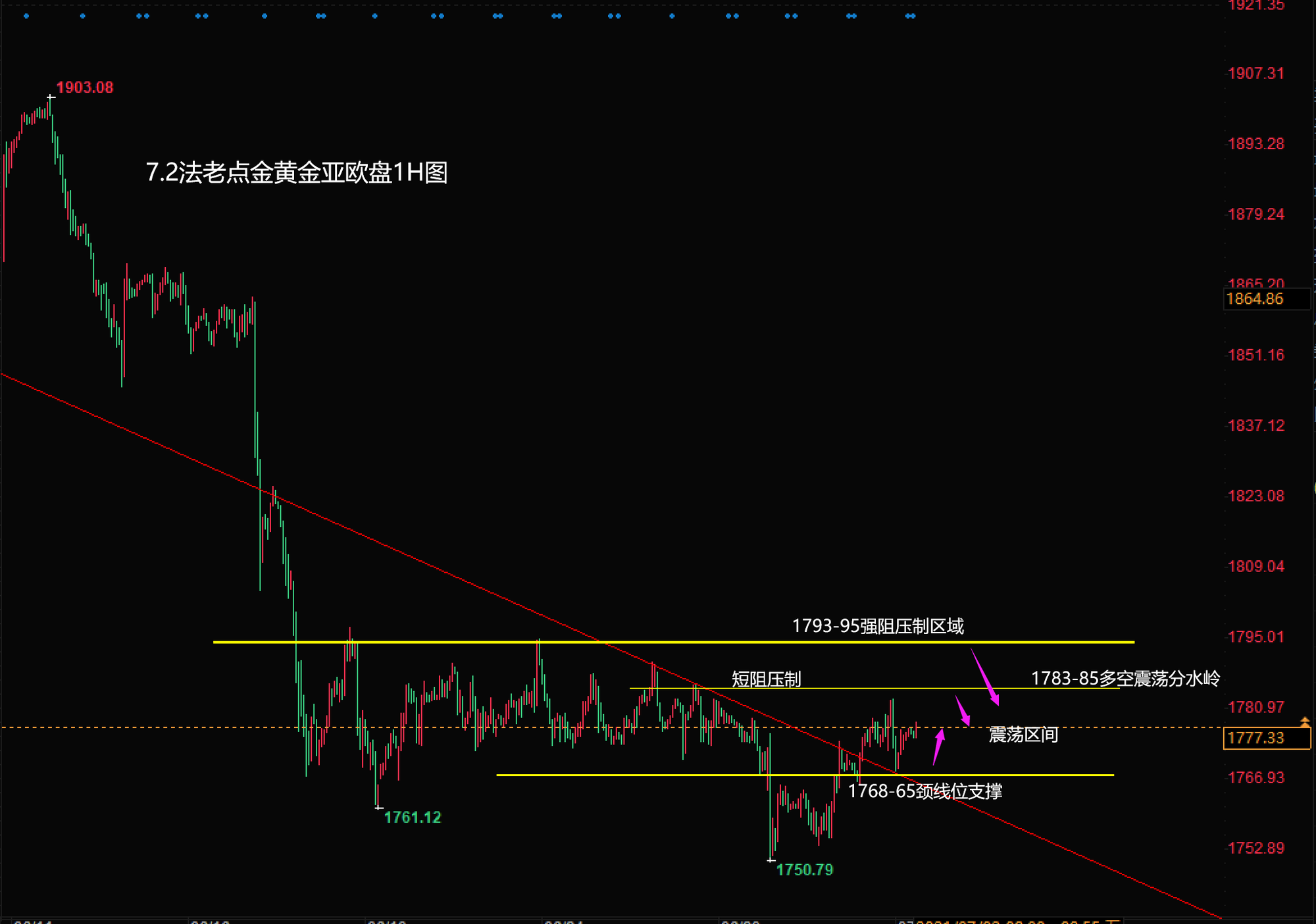 07/02 09 : 027.2【黄金】亚欧盘:黄金昨日1783空差之毫厘错失利润,今日非农前1785下方依旧压制震荡运行
