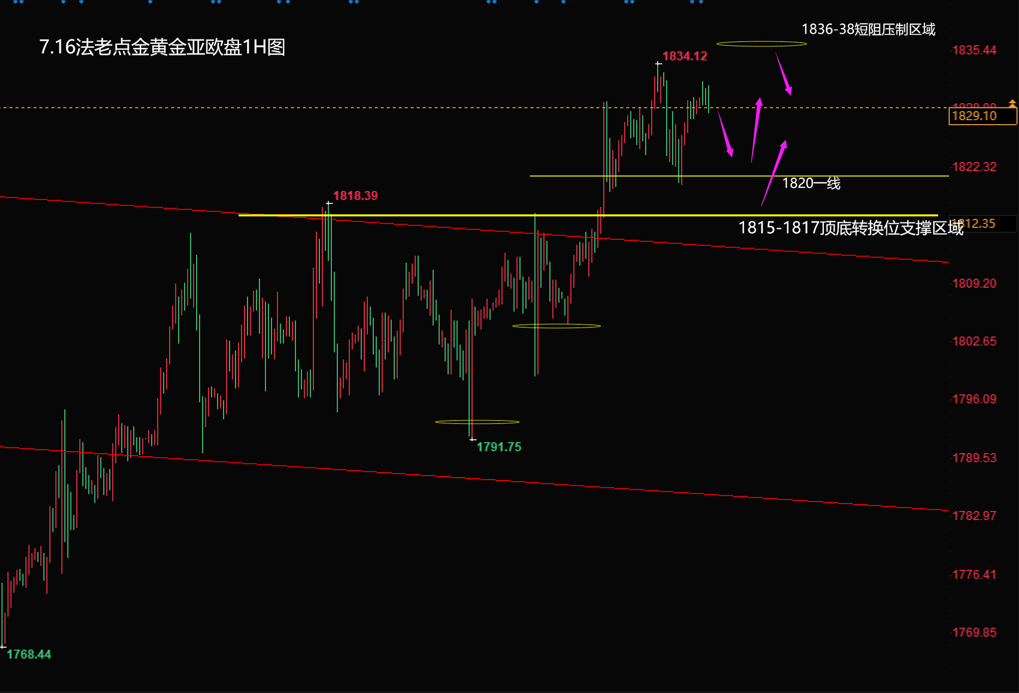 07/16 09 : 37【法老点金】7.16【黄金】亚欧盘:黄金昨1834空1825收,今日冲高还是空