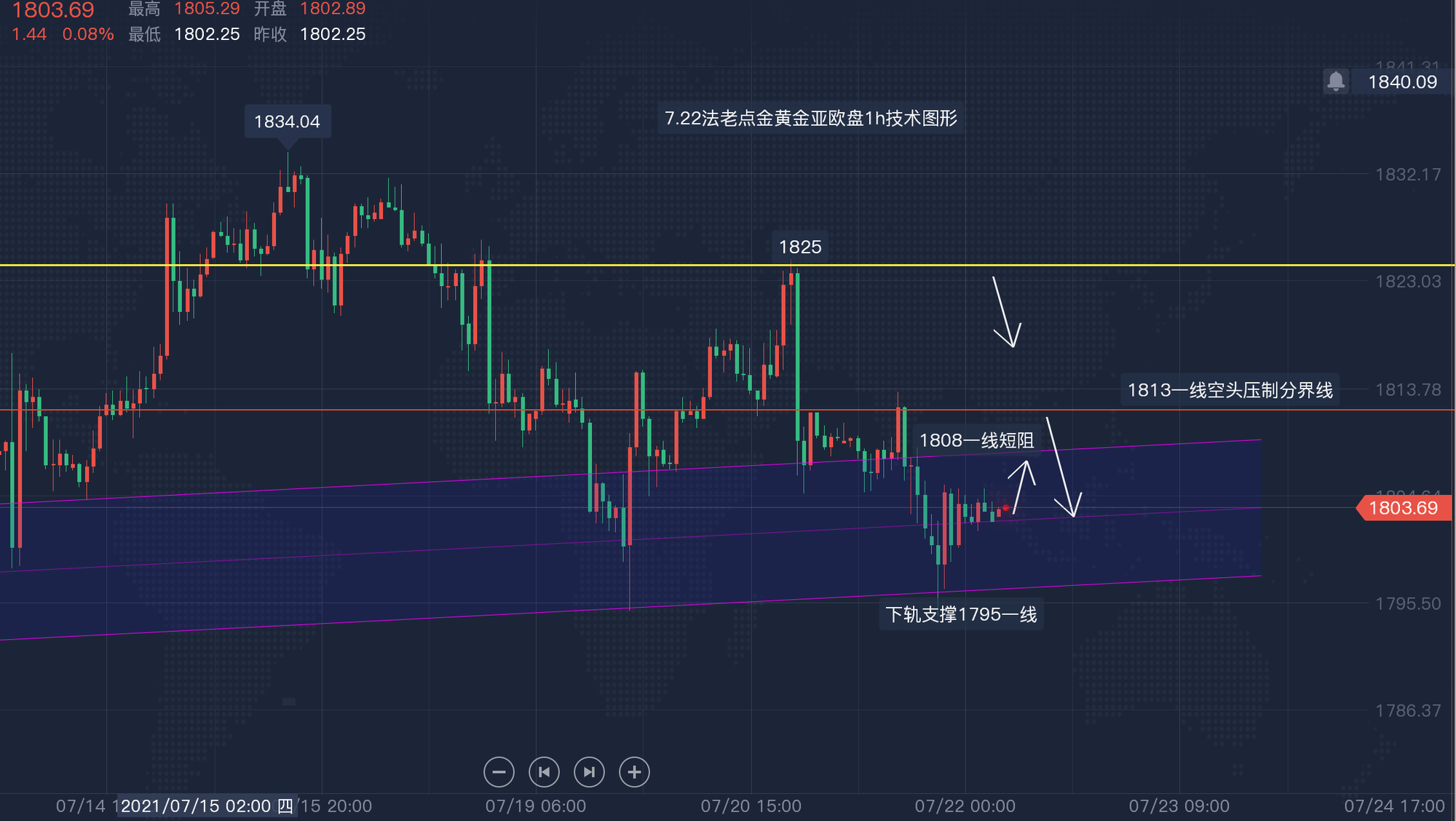 07/22 07 : 067.22【黄金】亚欧盘:黄金昨深度回踩测试1795支撑勉强震荡收盘,今日1813一线下依旧压制偏空