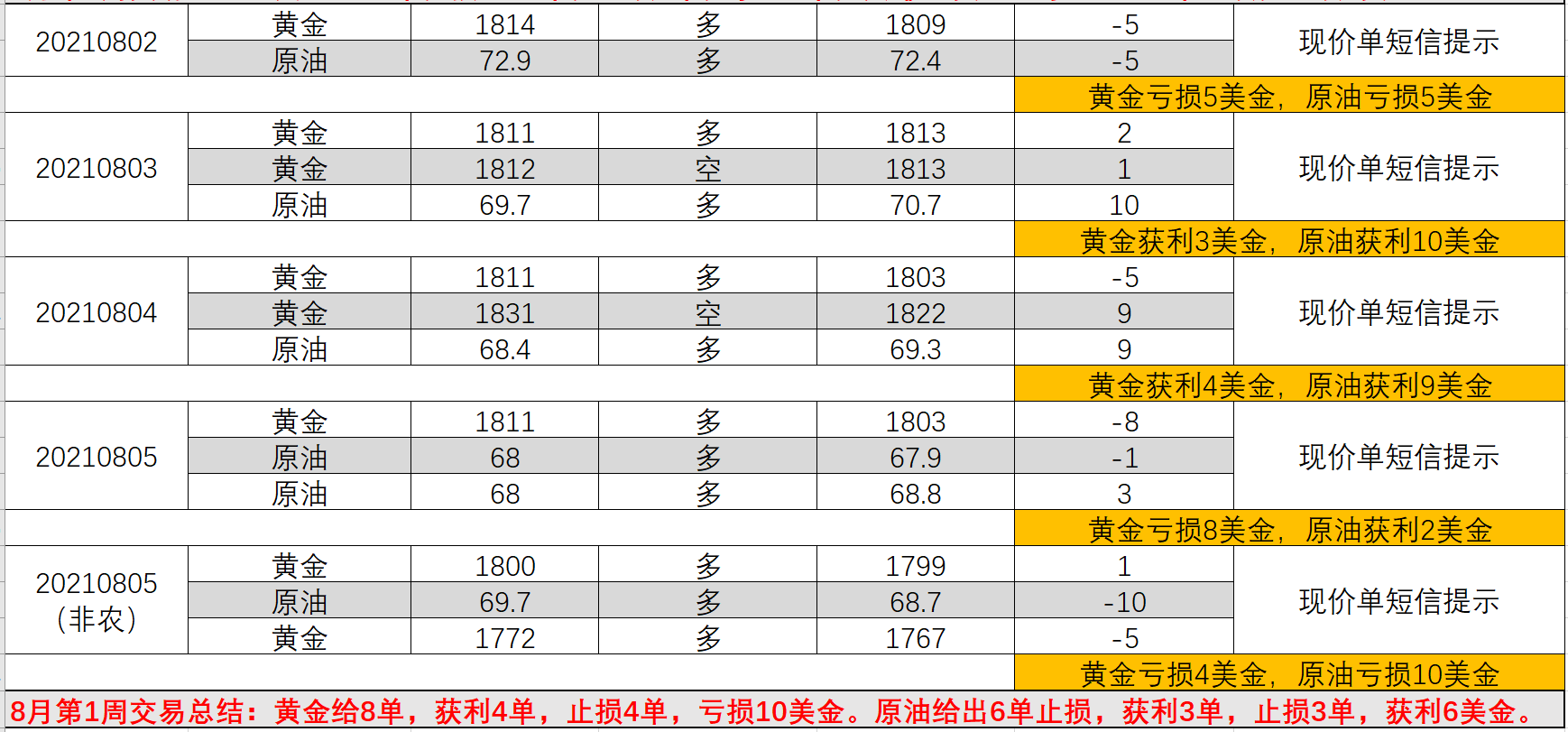 08/07 16 : 548月第一周短信喊单总结:黄金给8单,获利4单,止损4单,总共亏损10美金。白银,TD,纸白银先是爆赚没出后在大非农中失败出局,8月重新布局。原油给6单,获利3单,止损3单,亏损6美金。8月第一周非农周,总体来说有两点,第一点,行情走的非常慢,5天时间,亚欧盘基本维持6美金波动,按照我的一单到底的风格,一单要拿1/2天,很难做出利润,其中,两次交易,最大赚15美金,没出最后止损出,得不偿失,所以,做的没有利润。第二点,数据行情是山海并不擅长的交易,ADP数据看多多单没有坚持,非农数据利空,在两次砸盘的影响下,犹豫错过了1791的空,所以总体错过了本周的最大波动,总结起来,有时候坚持了不该坚持的,没有坚持该坚持的,但这都是马后炮,做交易还是细水长流,稳健获利,毕竟这周走势的情况非常少,下周回归到技术面,重新做一单到底的大利润。调整思路,8月不在一股脑们儿的看多,整体看还是大范围震荡,可以交易高空低多。下周走势大概率是先跌后涨,跟上节奏。