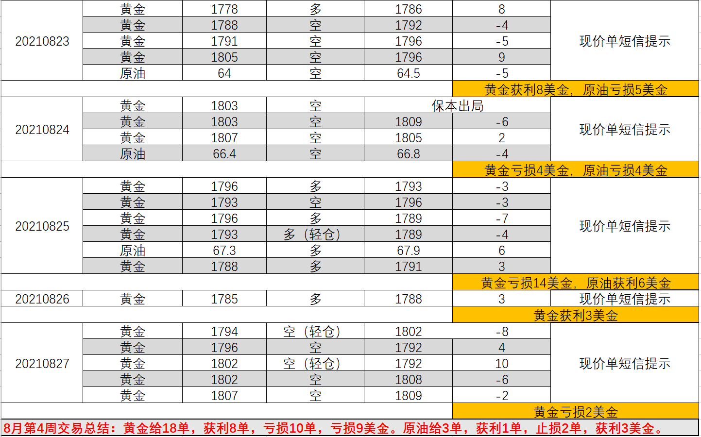 08/28 17 : 278月第4周短信提示交易总结:本周黄金没有做到连赚,交易没有回归到正常水准,总结起来,本周看行情没有坚持自己的看法,被外界影响较大,给单也过激,欲速则不达,总是追着行情走。不过,在周二,周四,周五行情中,已经体现出了山海的预测,其实看法已经通过解盘告知,预测也较为准确,只是没有给单,给出实际利润,通过本周交易,山海觉得对黄金这种复杂的诱导行情已经看清,越来越有信心做好未来的行情。8月黄金其实非常难交易,不过这不是做不好的利润,忐忑的行情将要过去,9月即将来临,会找回3/4/5/7大赚的状态,迎接连赚的节奏。未来将给大家丰满的利润。