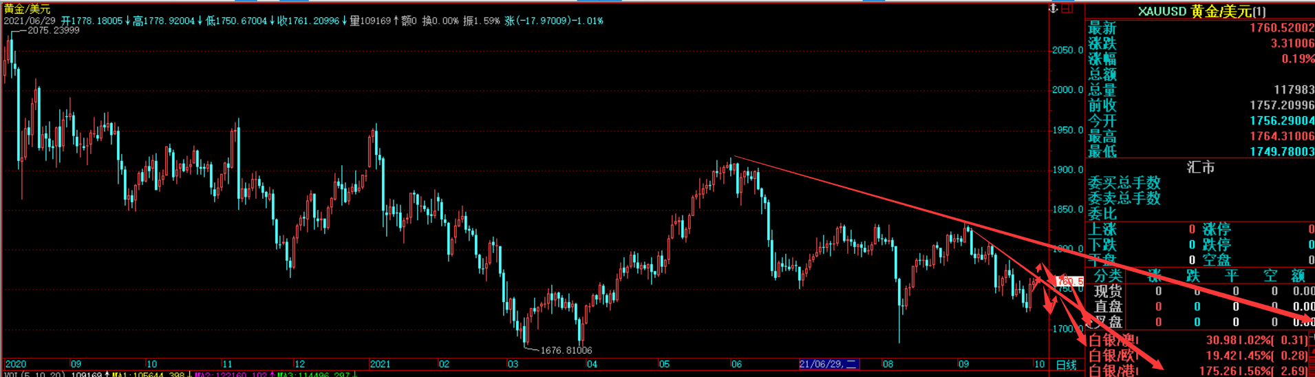 本周黄金白银整体如预期持续27号开始是持续复杂性的震荡下跌行情,而下跌也是复杂的震荡结构,本周周评与日内策略里我核心提醒大家预期黄金将持续震荡到10月初才结束,本次震荡下探过程离我们预期的目标1721只差1美元。所以有一点可惜,不然就在这里等待布局大的机会。而从基本面来看造成本周黄金白银持续震荡下跌的原因如下: