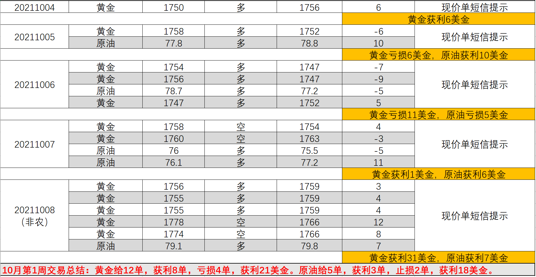 10/09 18 : 2410月第1周短信提示交易总结:10月第一周黄金的行情主要集中的周五非农这一天,前四天黄金一直震荡,波动不超过12美金,周一至周三几乎不超过8美金,天天来回震荡,走不出区间也拿不出利润,有两单获利没出止损,不然本周将正常大赚。还好周五非农取得了非凡的胜利,亚欧盘看涨,美盘坚决看跌,预测和交易完美结合,大赚31美金。保住了本周整体获利,为十月开局打下了良好的基础。年底近在眼前,交易细水长流,任重道远,争取10也翻几个仓出来。原油一如既往的稳,看单边上涨就一直做多,虽然周四有较大回落,但不影响节奏,继续看涨,上周给5单,赚3单,也有18美金利润,下周继续。