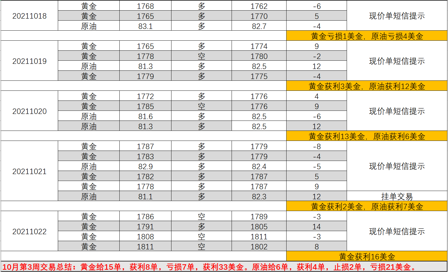 10/23 18 : 0010月第3周短信交易提示总结:本周黄金单子还是有点多,不过整体有利润,赚了33美金。本周黄金从周初就开始看多,做多,并且明确目标看1800之上,实际从1760开始上涨,走的很艰难,走了5天才走出大涨,思路是对的,过程很艰辛,同时对行情的看法和信心也逐步建立,状态也回来了。下周减少给单,不做不必要的交易,专注一单到底的大利润,回归到之前一周连赚的节奏。整体来看,下周黄金还是震荡偏强,由于距离11月非农较近,预计难以走出区间,市场也在等待非农后的多空爆发,走出稳定的方向。原油从7月,67就开始看涨,预计可见86,现在已经到84,这波做多了三个月,屡试不爽,本周又给21美金的大利润,下周顺势低多,看86但不猜高。