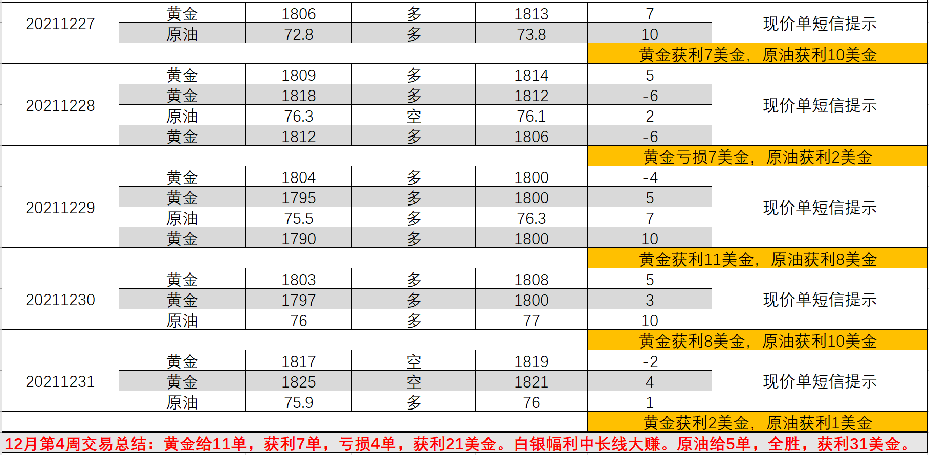 01/02 12 : 2312月第4周短信交易提示总结:12月最后一周,行情全部在我的预测内,交易节奏也较好,除周二两单获利未出反损外,每日交易都有比较稳健,踏实的利润。冬令时交易已经到了12月,整体交易稳健了很多,节奏也好了很多,一步一个脚印,沉淀自己,未新年新的开始做准备。白银12月给出的22.1/23.2多单大赚,耐心持有还有上涨空间。原油本周节奏非常好,5单全胜,无止损,给出31美金的大利润,下周继续。2021旧年多半是灰色的,起伏不定,一切都按部就班,平平安安,希望2022新年心想事成,多点精彩,最好是五颜六色,像花儿一样灿烂。