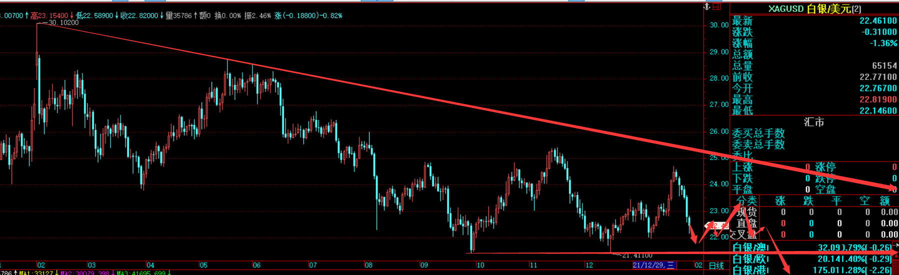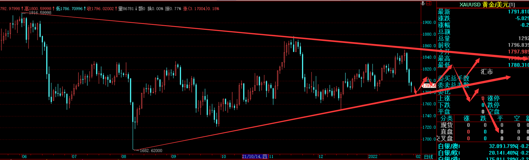 ; ; ;本周黄金银本周先涨后跌,本周评的时候我重点强调关注21号转折,但21号转折先是成为小低点震荡向上,但是周三出现了逆转开始出现大幅下跌,所以整体变成持续看空为主。所以周三开始持续高空为主。本周黄金出现了11月26日以来最大周阴线,收跌2.35%至1791.57美元/盎司,盘中跌破1780美元关口。而基本面来看造成本黄金白银先涨后跌的原因如下: