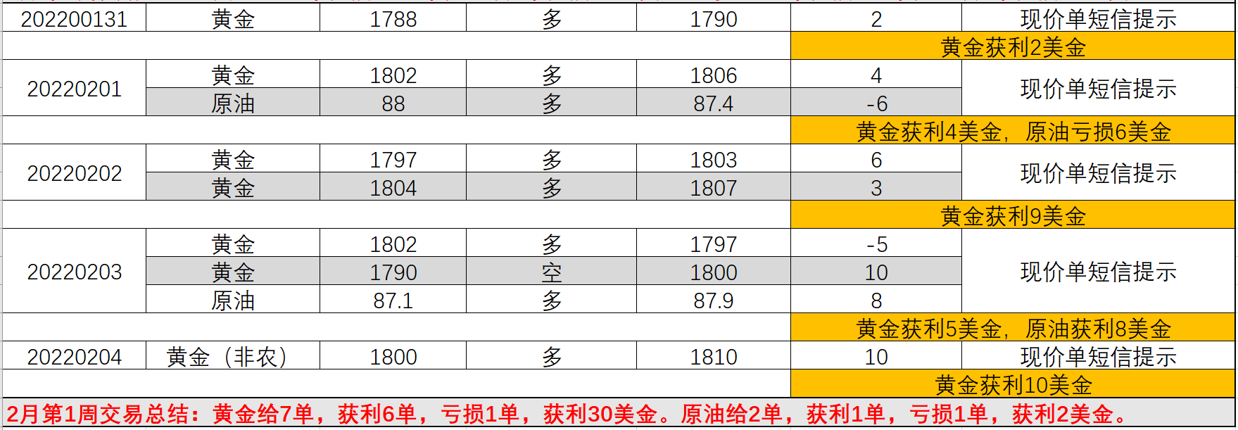 02/05 11 : 472月第1周山海短信提示交易总结:春节开盘不打烊。本周行情不大,行情走的比较慢,单子也给的比较好,黄金总共给出7单,获利6单,亏损1单,获利30美金,白银幅利单给出中长线获利中,耐心等待大利润。原油给出2单,盈利2美金。整体来讲,非农影响不大,来回扫盘没有走出区间,奠定2月黄金基本还是震荡走势,大行情在3月美联储加息上,2月继续稳健,持续的积累利润即可。