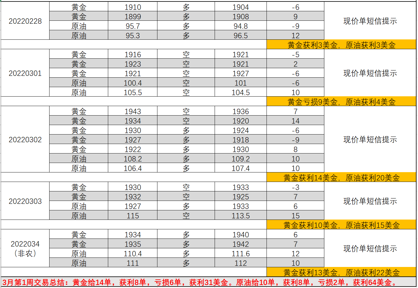03/06 16 : 583月第1周短信提示总结:受大环境,市场影响,黄金,白银,原油行情波动较难预测,涨跌较为难受,加上上周非农数据周,黄金出现较大波动空间,整体来做算是可以的,但周五非农后没有预测出那么大的上涨幅度,最终遗憾留单隔周。全周给出14单,获利31美金,原油抓住了趋势力度,屡次做多,屡次获利,总共给出10单,获利64美金大赚。下周重点还是在地缘局势影响下,3月加息行情可能在月中后出现,我们持有的空单算是高位,可以持有看下周或者加息大行情。