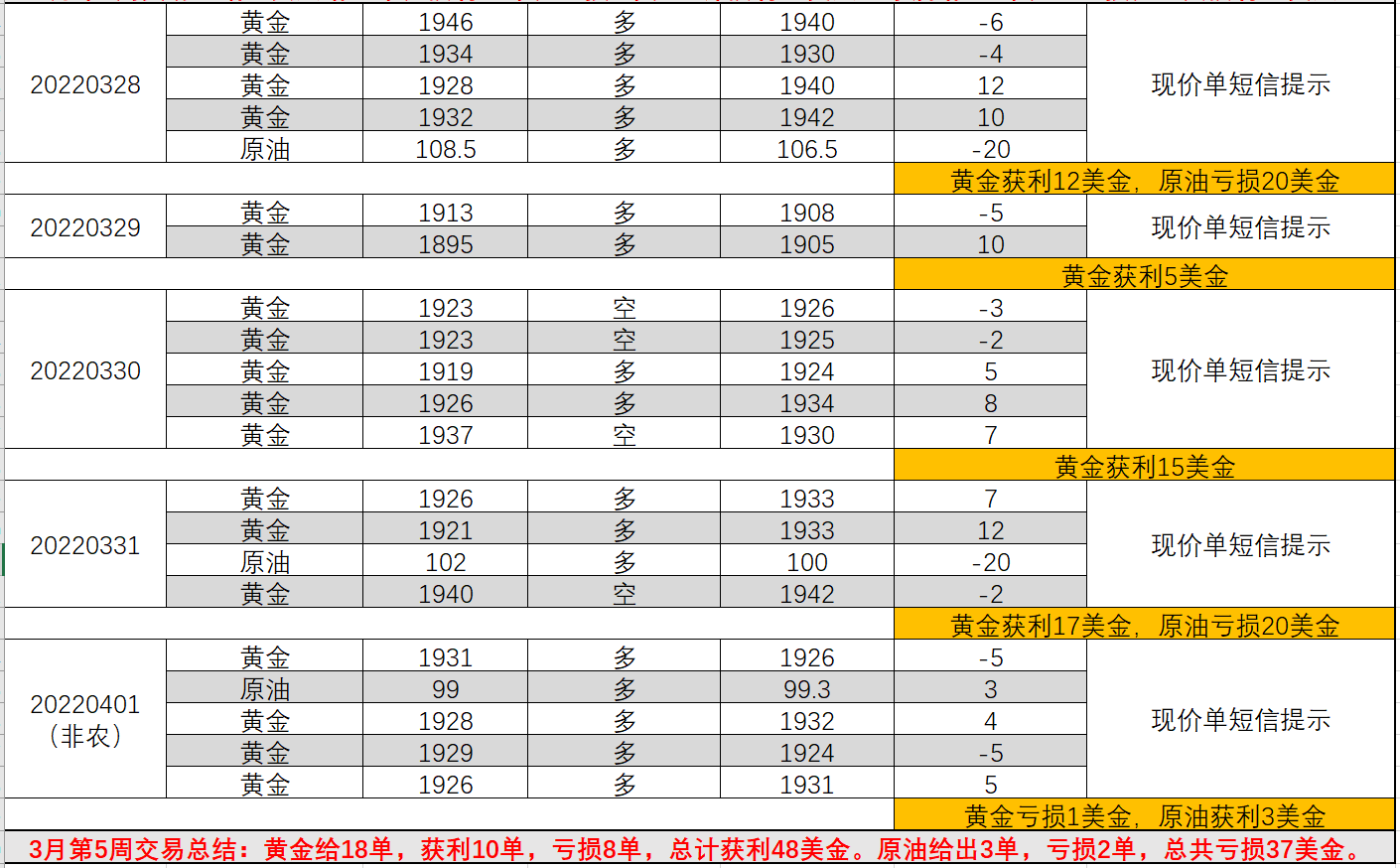 04/03 19 : 433月第5周短信交易提示总结:本周交易其实很书顺畅,周一至周四都给出了不错的利润,虽然周五行情没有抓住,但也不至于大亏,非农数据来回,来回扫盘走势比较多,而且都是短线利润,四波赚钱没出,最后遗憾亏损1美金收场。全周单子较多,给出了48美金的利润,对于3月来说给出了满意的答卷,整个3月无刷单,无扛单,只做利润,实打实的贡献出233美金的大利润。原油最后一周其实可以大赚,每次赚15美金以上没出,最后亏损,有点得不偿失,最后一周利润缩水,不过3月也是大赚,期待4月交易。4月刚刚开始,节假日开盘不休息,大家跟上节奏,抓住春天的收益。