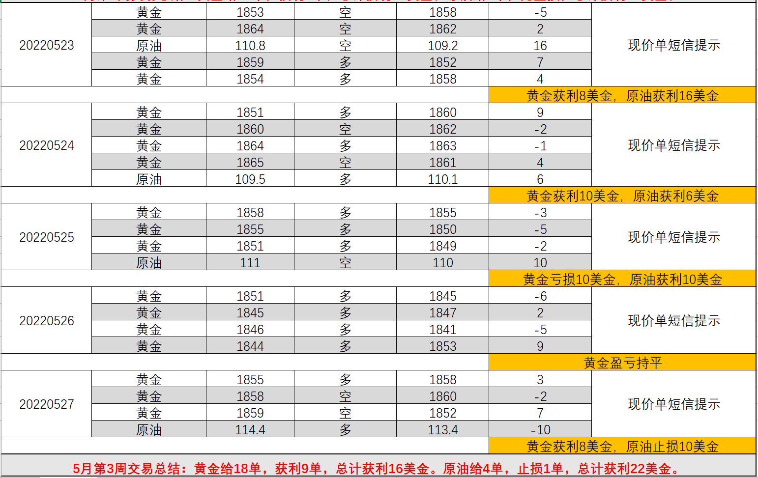 05/28 16 : 265月第4周杨阳短信提示总结:本周预测还是比较准确,自1788筑底以来,看涨至1870,再在1870转头看调整至1845,1840筑底后延续多头上涨至1860,多空循环基本全部预测到位,但实际交易比较难做,多空进场较难准确的把握,因此实际给单较差,本周才赚18美金,总结起来,单子给的太多,点位判断不准,利润难拿到手。下周黄金重点在6月非农,预计还是震荡,先跌涨,1840还要去一次,较难拉开区间,做区间交易。5月即将结束了,最难的时候也要过去,6月新的起点,抓住机会,找到3,4月状态,收割利润。原油一如既往的稳健,本周再次给出22美金利润,下周保持状态, ;每日一单,继续拿利润。