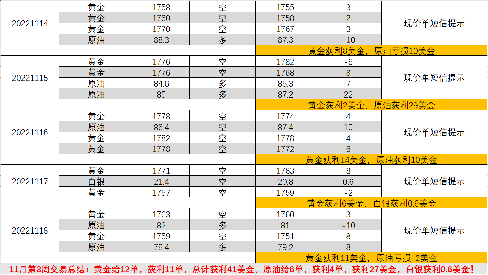 11/19 21 : 5111月第3周提示交易总结:本周交易力王狂澜。黄金,白银,原油期货都取得了不错的成绩。其中黄金在1782抄顶,全周给出12单,获利11单,总计获利41美金,还有更大的利润是抄顶空单还没有出,现价1748收盘,目前已经获利接近30美金,可继续持有看下周更大的利润。下周预计可见1700之下。白银出局的21.9的中长线目前也在持有中,下周看20。原油给出6单获利27美金,目前收盘在80.2,下周继续看涨至85,88。期货交易也是抄顶黄金白银,沪金持有405压制空,沪银持有5000的空,均有利润,等待下周空头放量。具体行情分析明天文章中给出。