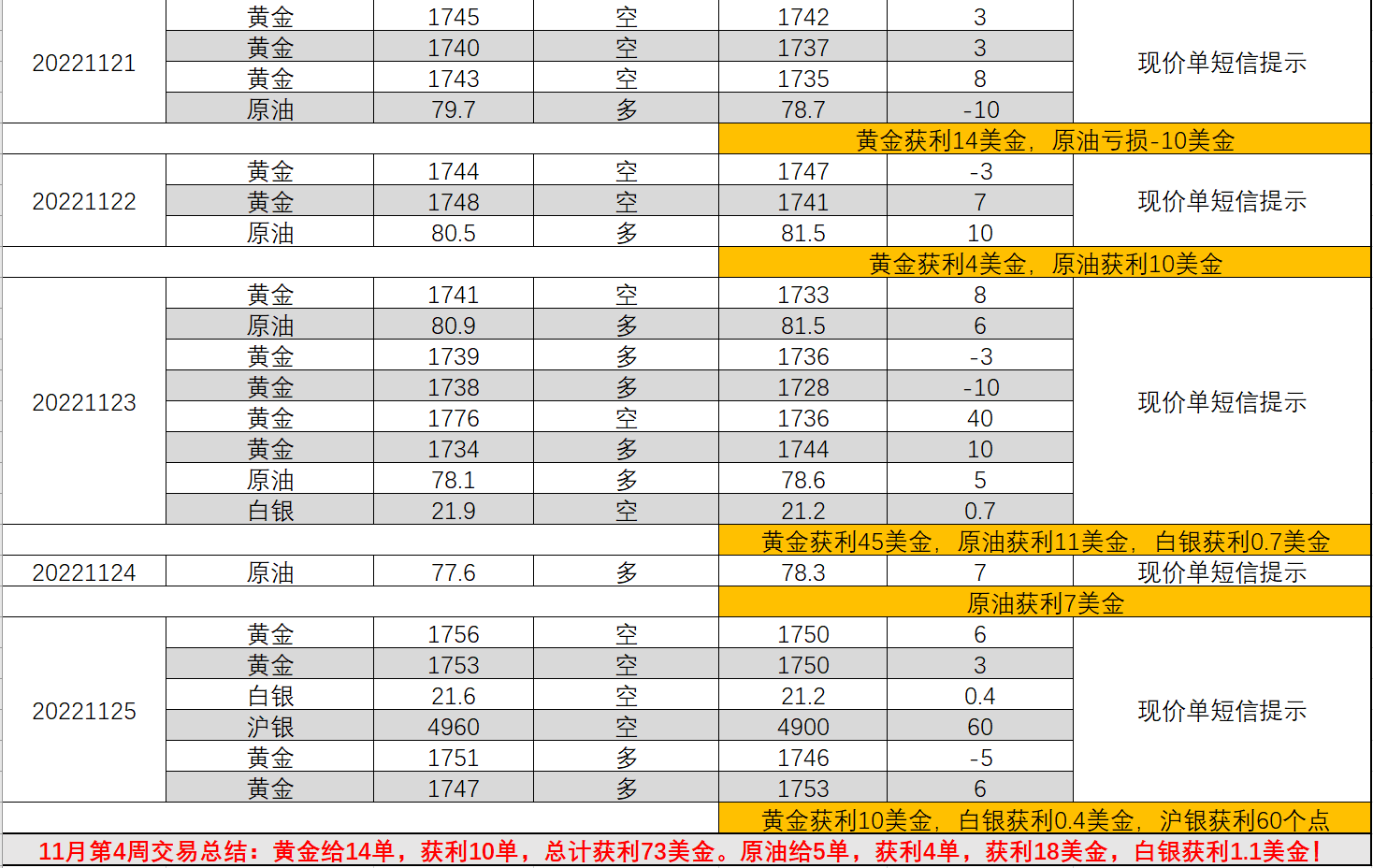 11/26 14 : 1311月第4周交易提示总结:本周交易利润持续走高。整体来讲,五个交易日,四天的行情,虽然交易时间不多,但金银都有周期性变化,其中,黄金,在跌至1730后上涨,山海前期给出的1776空单在1736出局,大赚40个点,白银跌至20.6后上涨,山海给出的21.9空单在21.2出局,再赚0.7美金。黄金全周给出14单,整体获利73美金,白银全周获利1.1美金。原油全周给出5单,获利4单,给出18美金。期货这边沪金波动不大,持有405压制空一直动不了,沪银给出5000空最大利润有200个点,短线4960空也在4900止盈。整体全周再接再厉,创造佳绩。下周黄金,白银,原油,期货要做12月非农数据,暂时黄金,白银都保持震荡,等数据公布拉开区间,详细分析周日文章中给出。受市场消息面影响,原油尾盘再跌,近期较难起来,下周依旧做短线积累。