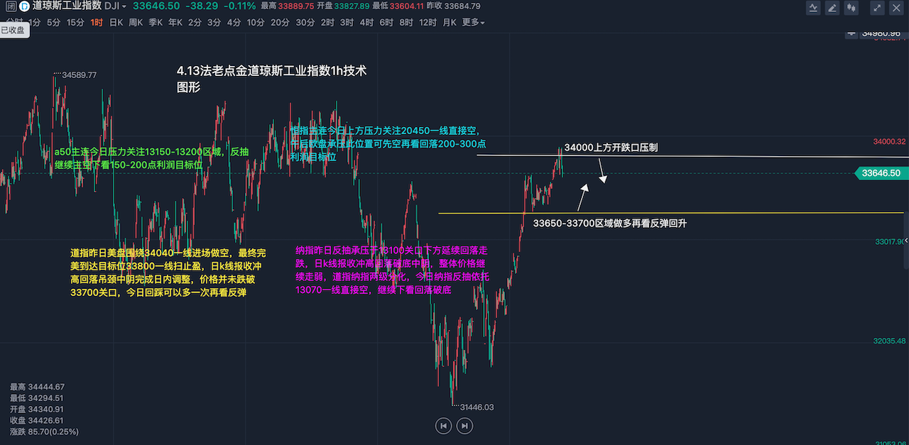 道指昨日美盘围绕34040一线进场做空,最终完美到达目标位33800一线扫止盈,日k线报收冲高回落吊颈中阴,不过凌晨价格二次回踩下探并未完全下破33700关口,此位置也是近期关键支撑位置,技术指标在昨日探底冲高回落后快速完成日内调整,今日有望继续走震荡回升修复,下方支撑关注33700-33650附近,上方短线压力34000上方,日内依托此区间继续看多空震荡运行,纳指昨日反抽承压于13100关口下方延续回落走跌,日k线报收冲高回落破底中阴,整体价格继续走弱,近期道指纳指出现两级分化,纳指依旧延续空头震荡下行节奏,今日纳指上方短线压力关注13070-13100附近,米股开盘前反抽依托13070一线直接空,继续下看回落破底,道指近期多空强弱分水岭关注33700关口,日线级别企稳此位置上方继续看多头震荡上行节奏,纳指近期走势跟道指有所分化,纳指短线还有进一步回落调整预期,今日上方压力关注13070-13100附近,米股开盘前反抽承压此位置继续主空再看回落,今日继续保持反抽主空节奏不变,耐心等待关键压力位进场,具体操作策略我会在盘中提示,及时关注。