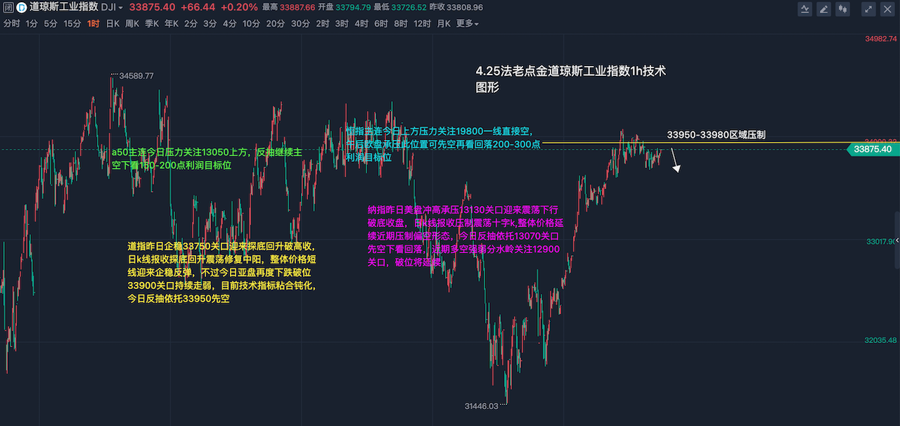 道指昨日企稳33750关口迎来探底回升破高收,日k线报收探底回升震荡修复中阳,整体价格短线迎来企稳反弹,不过近期日线级别技术指标处于粘合钝化形态,并没有明显的多空强弱力度,且今日亚盘再度下跌破位33900关口持续走弱,短线还有进一步下行预期,今日反抽依托33950先空看延续回落,近期多头强势分界线关注34050关口,日线级别未突破并站稳此位置之前继续保持反抽主空节奏不变,纳指昨日美盘冲高承压13130关口迎来震荡下行破底收盘,日k线报收压制震荡十字k,整体价格延续近期压制偏空形态,今日反抽依托13070关口先空下看回落,近期多空强弱分水岭关注12900关口,破位将延续,纳指日k线目前压制运行于5日均线下方,短线还有进一步调整回落预期,今日道指纳指反抽均先空一次下看延续回落走跌,日线级别未突破并站稳5日均线之前继续保持反抽主空形态不变,具体操作策略我会在盘中提示,及时关注。