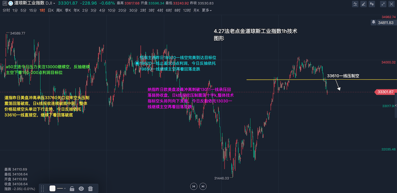 道指昨日美盘冲高承压33760关口迎来空头压制震荡回落破底,日k线报收连续破底中阴,整体价格延续空头单边下行走势,昨日美盘围绕33800布局做空最终遗憾未能进场,错失这波空头利润,本周价格跌破34000整数关口多空迎来转折,日线级别技术指标已经开始向下发散,空头力度正逐步释放,短线还有进一步下行预期,今日反抽依托33610一线直接先空再看延续回落,近期多头强势分界线关注34050关口,日线级别未突破并站稳此位置之前继续保持反抽主空节奏不变,纳指昨日欧美盘凌晨冲高刺破13011一线承压回落弱势收盘,日k线报收压制震荡十字k,整体技术指标空头排列向下发散,今日反抽依托13030一线继续主空再看回落走跌,虽然昨日日k线报收压制震荡十字k,但目前形态以及价格在高位形成背离,目前位置的震荡十字k大概率是多空转折形态体现,整体趋势延续近期压制偏空形态,今日反抽依托13050一线继续先空下看回落,同时目前道指纳指日k线依旧压制运行于5日均线下方,下行空间有望进一步打开,今日道指纳指继续反抽先空下看延续回落走跌,日线级别未突破并站稳5日均线之前继续保持反抽主空形态不变,具体操作策略我会在盘中提示,及时关注。