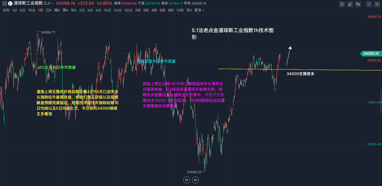 道指上周五整体价格如期企稳33750关口迎来多头强势拉升破高收盘,和我们周五研报以及视频解盘预期完美验证,日线级别级别迎来连阳破高强势多头主升节奏,短期技术面技术指标站稳10日均线以及5日均线重回多头强势形态,今日下方支撑继续关注34050-34000区域,日内回踩依托此区域继续主多再看多头延续上涨,上方目标位继续关注破高,整体节奏上继续保持顺势低多参与主思路,下方多头强势分界线关注33750关口,日线级别企稳此位置上方继续保持顺势主升节奏不变,纳指上周五企稳13170关口继续迎来多头强势拉升破高收盘,日k线迎来连阳拉升破高走势,短期技术面重回多头强势主升节奏中,今日下方支撑关注13200-13170区域,日内回踩依托此位置支撑继续低多顺势看涨不变,上方目标位继续关注破高,周五强势破高收盘目前道指纳指均已经打开多头上行空间,继续保持回踩顺势低多参与主基调不变, ;逆势空单一律不参与,具体操作策略我会在盘中提示,及时关注。
