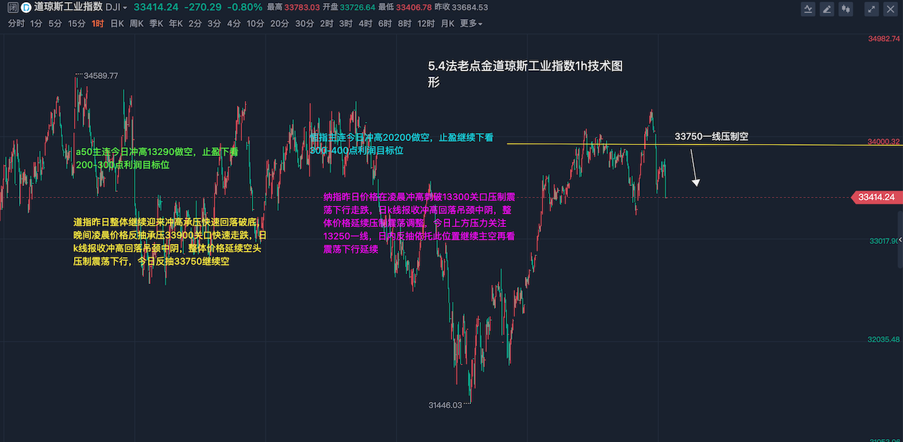 道指昨日整体继续迎来冲高承压快速回落破底,晚间凌晨价格反抽压制于33900关口快速走跌,凌晨延续下行至33250关口弱势收盘,日k线报收冲高回落吊颈中阴,整体价格延续空头压制震荡下行节奏,今日上方压力关注33700-33750区域,米股开盘前反抽依托此位置继续做空顺势下看破底,日线级别高位出现明显压制调整形态,短周期技术指标空头排列向下发散,整体节奏上继续保持反抽主空节奏不变,下方目标位继续关注破底,近期多空强弱分水岭34000整数关口,日线级别未突破并站稳此位置之前,任何反抽均是做空机会,保持顺势参与主基调,纳指昨日价格在凌晨冲高刺破13300关口压制震荡下行走跌,日k线报收冲高回落吊颈中阴,整体价格延续压制震荡调整,今日上方压力关注13250一线,日内反抽依托此位置继续主空再看震荡下行延续,目前道指纳指均已出现明确压制调整形态,整体操作上继续保持反抽主空节奏不变, ;逆势多单一律不参与,具体操作策略我会在盘中提示,及时关注。