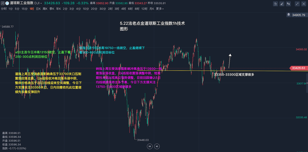 道指上周五受消息面影响承压于33700关口压制震荡回落走跌,日k线报收冲高回落吊颈中阴,整体价格承压于20日均线迎来震荡调整,日线级别短中期均线粘合,短期来看大概率会继续以时间换空间迎来多空震荡运行节奏,目前日线级别双底33000关口支持有效,此位置也是近期多头强势分界线,日线级别企稳此位置上方继续保持多头震荡上行节奏不变,今日下方支撑继续关注33350-33400区域,日内回撤依托此位置继续先多看反弹回升,近期道指纳指全部回到强势多头震荡上行节奏中,日线级别依托33000整数关口上方继续保持多头震荡上行节奏不变。纳指上周五受消息面影响冲高承压于13930一线震荡回落收盘,日k线报收震荡调整中阴,短周期技术面延续高位强势调整,目前回踩确认5日均线继续保持主多节奏,今日下方支撑关注13750-13800区域继续多,目前短中期均线依旧保持完好多头形态,强势多头主升行情上不言顶,任何回撤均是介入多单机会,米股开盘前回踩企稳13750一线继续保持顺势低多看涨,逆势空单一律不参与,具体操作策略我会在盘中提示,及时关注。