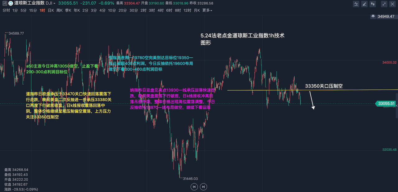 道指昨日欧盘承压于33470关口快速回落震荡下行走跌,晚间美盘二次反抽进一步承压33380关口再度下行破底收盘,日k线报收震荡回落中阴,整体价格继续呈现压制偏空震荡,目前日线级别短中期技术指标有死叉向下趋势,今日亚盘价格再度延续回落走跌,日内还有进一步下行破底预期,今日上方短线压力关注33350一线压制,日内反抽依托此位置继续主空再看回落,短期价格有望进一步回落下行试探前期日线级别双底33000整数关口,今日反抽主空看破底,纳指昨日亚盘见高点13930一线承压回落快速走跌,晚间美盘震荡下行破底,日k线报收冲高回落吊颈中阴,整体价格出现高位震荡调整,今日亚欧盘反抽依托13870一线先行做空下看延续回落,下方短线支撑关注13550-13600附近,整体围绕13550-13850区间看多空宽幅震荡运行,中间位置一律多看少动谨慎追单,耐心等待关键点位进场,具体操作策略我会在盘中提示,及时关注。