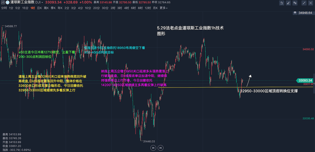 道指上周五企稳32800关口迎来强势探底回升破高收盘,日k线报收震荡回升中阳,整体价格在32600关口形成支撑企稳形态,上周五提到过短期多空强弱分水岭关注33100关口,日线级别未突破并站稳此位置之上有望重回多头强势震荡区间,目前日线级别强势反包中阳突破站上33100关口,今日回撤依托小时线颈线位32950-33000区域主多继续看反弹回升延续,今日早盘跳空高开延续多头强势反弹回升,午后借助回踩继续主多上看,纳指上周五企稳13950关口延续多头强势震荡上行破高收盘,日k线报收单边加速中阳,继续保持强势单边上行节奏,今日回撤依托14200-14250区域继续主多再看反弹上行破高,纳指道指本周节奏同步双双进入到多头震荡上行节奏中,只要给到回撤就是进场做多机会,继续保持顺势主升节奏不变,逆势空单需谨慎,具体操作策略我会在盘中提示,及时关注。