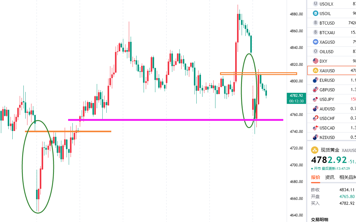 近期随着中东局势多变,市场情绪也是反复,就像你呼吸不能一口到底,前一天还聊的好好的,第二天就掀桌子,这就是现状,其实更多的也是双方的博弈,目的是为了给各自争取更多的利益,日内黄金低开低走到4737附近企稳反抽,亚盘一度强势突破4800惯性拉伸到了4814一线,但是延续性有限,没有跟上周一一样补缺口就再度回落,我们就上了当,做多小赚没出给洗掉了,欧美盘关注回踩企稳情况,依托4810/20附近压力先空,关注4740/30附近支撑企稳情况,操作上先空后多思路对待。